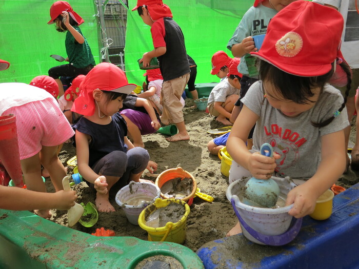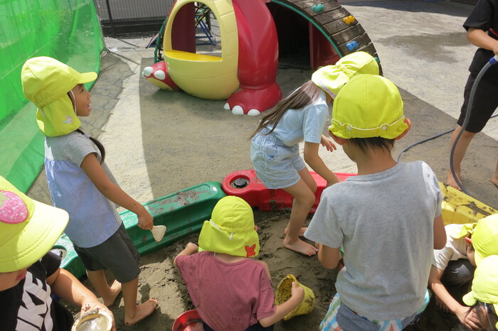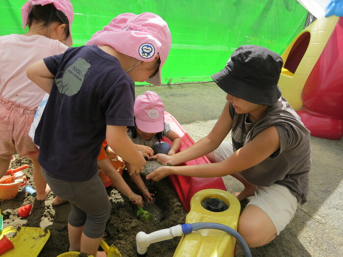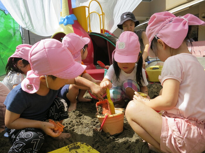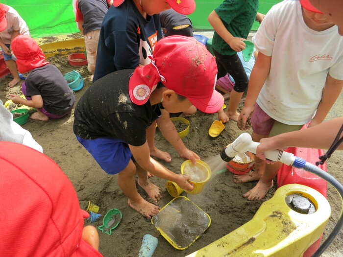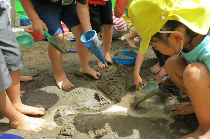 子ども達も楽しみにしていた泥んこ遊びを行いました。泥んこ遊びは子どもたちの造形力や想像力を養うだけでなく、子どもが自然に親しむきっかけにもなる遊びです。砂に水を加えることで感触が変わったり、形が自由に変形することを楽しんでいた子どもたち。砂場用玩具を使って友だちと協力して穴を掘ったり川を作ったり、ミルクティーに見立てておままごと遊びをしたりと、友だちとイメージを共有して遊んでいました。泥は粘度によって感触が変化するため、手でこねて遊ぶだけでも子どもの五感を刺激することが出来ます。 今後も自然の素材に触れる活動を取り入れていきます。 | ||