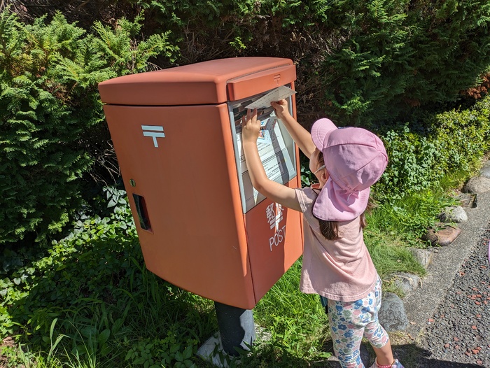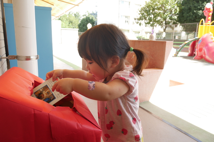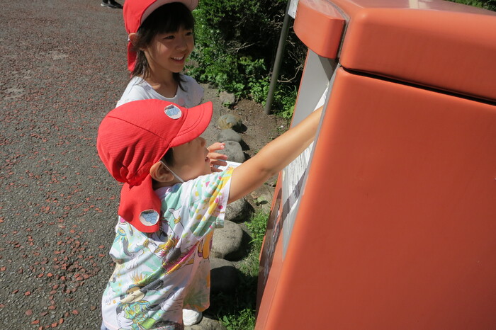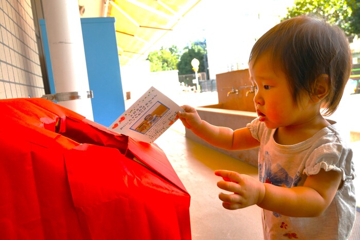 「敬老の日」におじいちゃんおばあちゃんに子どもたちの笑顔が届くよう、ハガキを投函しました。 幼児クラスはお散歩の途中にある保育園の近くにあるポストへ、乳児クラスはベランダに置かれた手作りポストに一人ずつ投函しました。 ポストの中を覗き込んで「おじいちゃんおばあちゃんのおうちに、届きますように」と願うようにハガキに手を振る小さなお友だちや、「この後ね、赤い郵便車が来て、ハガキを集めておじいちゃんおばあちゃんのおうちに配ってくれるんだよ」と教えてくれる幼児クラスのお友だちもいました。おじいちゃんおばあちゃんが喜んでハガキを見てくれることを想像しながらまた笑顔になる子供たちでした。 いつまでもお元気で、子どもたちを見守っていてください。 | ||