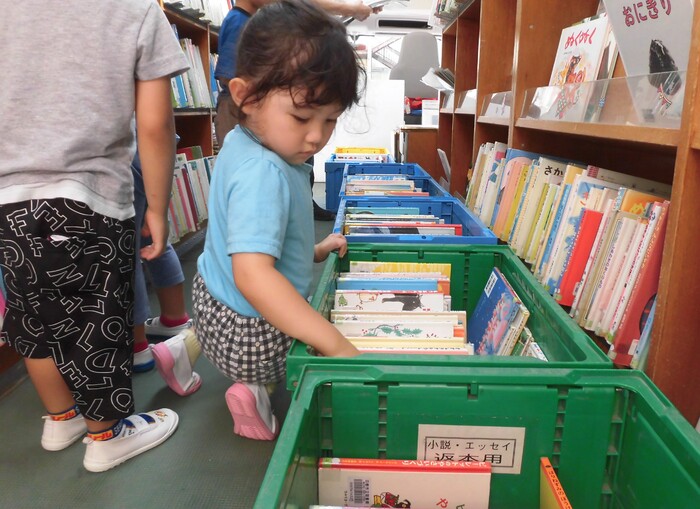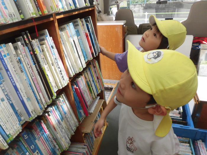 絵本が大好きな子どもたちはひまわり号の来園を今か今かと心待ちにしていました。 「この絵本だいすき!」と大好きな絵本を手に取ったり、「車の絵本だ!」とお気に入りの絵本を見つけて嬉しそうな子どもたちです。お部屋では借りた絵本をじっくり集中して読む姿が見られました。今後もたくさんの言葉に出会い、想像力が育まれるように様々な絵本に触れることのできる機会を作っていきたいと思います。 | ||