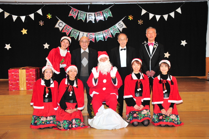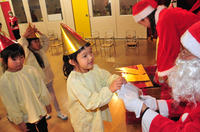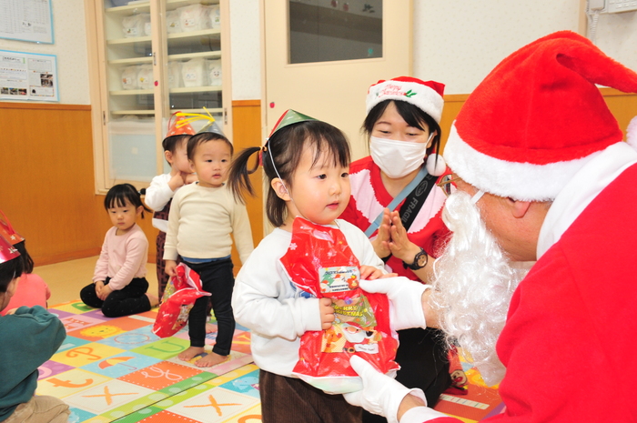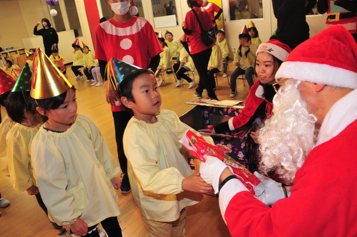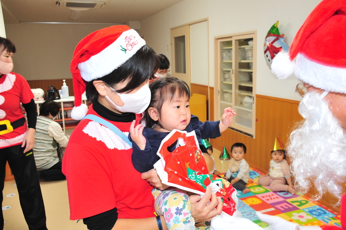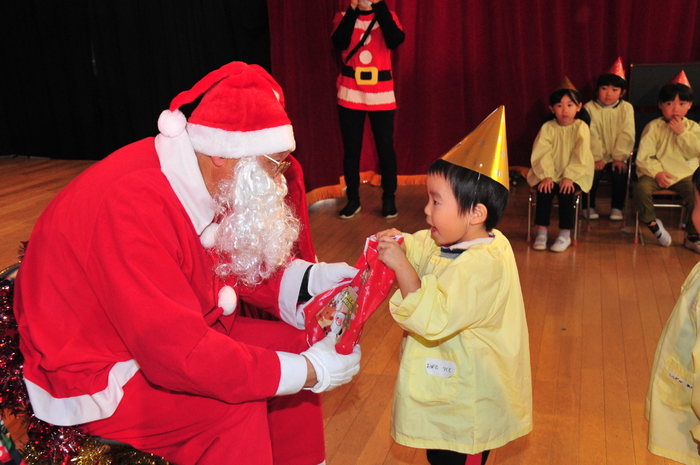 12月13日にクリスマスお楽しみ会が行われました!先生たちのダンスとハンドベルからはじまり、日野マジッククラブの方によるマジックショーは、空っぽの箱からいろんな物が飛び出てきたり、ボールが増えたりと「すごーい」とみんな驚きの連続でした。 エルフからの動画を見た後、待ちに待ったサンタクロースの登場!“どこから来るのかな?”と周りをキョロキョロ。サンタさんが登場すると大歓声の子どもたち。1人ずつ手渡しでプレゼントをもらい、子どもたちからはクリスマスの歌と踊りのプレゼントをしました。 0,1,2歳児のお部屋にもサンタクロースが来てくれました。少しビックリしながらも手を伸ばして、ドキドキしながらプレゼントをもらっていました。驚いたり、笑ったり喜んだりととても楽しい時間を過ごすことができました。 | ||