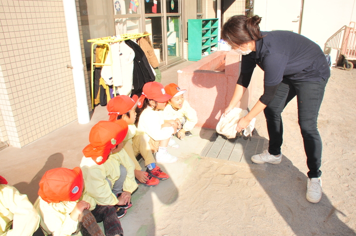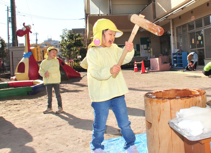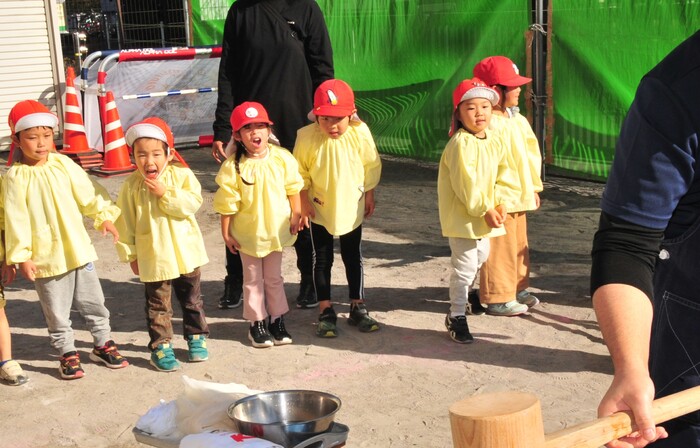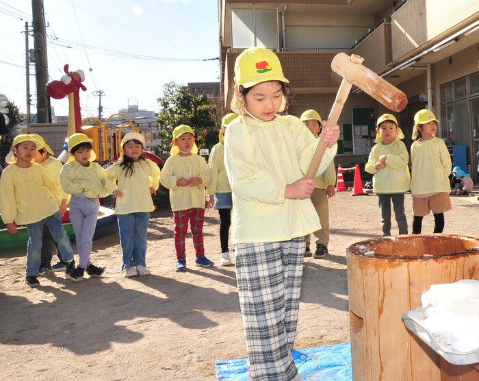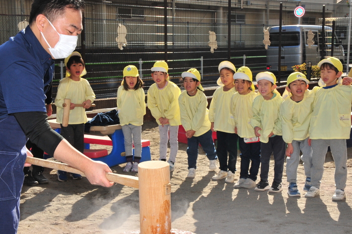 12月20日(水)はおもちつきを行いました。普段見慣れない臼や杵の紹介を聞き、興味津々の子どもたちの姿が見られました。 さくら組がもちつき体験をすると、「よいしょー!」とみんなで元気いっぱい掛け声をかけながらつき、楽しむことが出来ました。最後に給食の先生がついたお餅をびよーんと伸ばして見せてくれると、お餅が伸びる様子に「すごい!」「たくさん伸びるね!」と驚いた様子の子どもたちでした。日本の伝統行事を楽しく体験できた子どもたち、今後も様々な伝統行事に触れる機会を作り、たくさんの経験ができる環境を作っていきたいと思います。 | ||