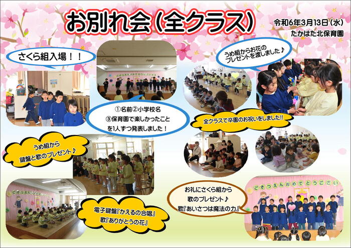 3月9日(土)にさくら組の卒園式が行われました。この日のために、式の練習や歌の練習をしてきた子どもたち。本番当日は、少し緊張した表情がみられましたが、証書授与では、名前が呼ばれると大きな声で「はい」と返事をし、背筋を伸ばししっかりと受け取りました。その表情はとても立派なさくら組でした。職員からは、子ども達や、保護者の方々へ感謝を込めて「旅立ちの日に」を合唱し温かな卒園式を送る事が出来ました。 | ||