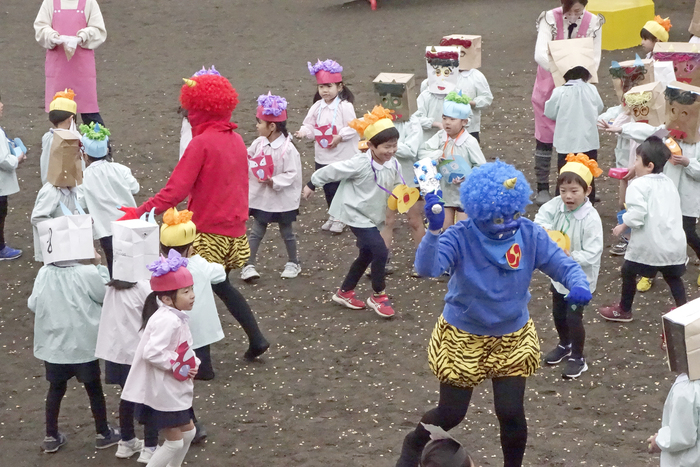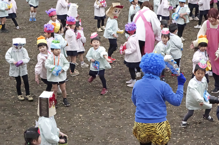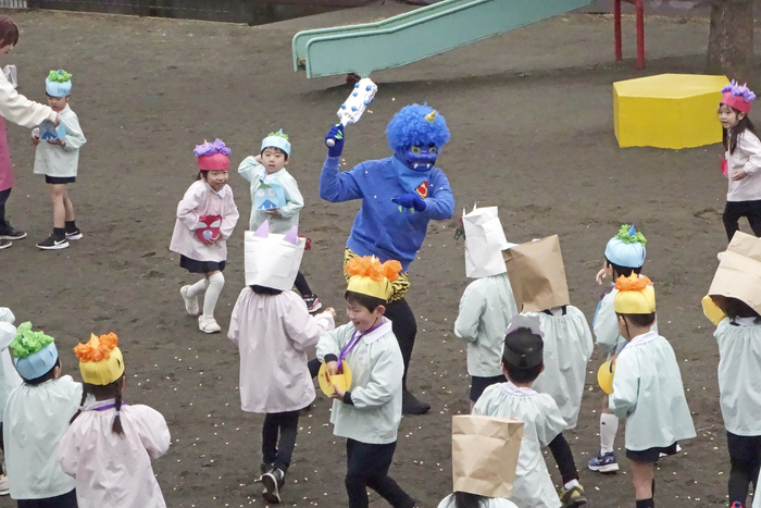 2月3日の節分の日、園庭で豆まきを行いました。 子どもたちは自分で作った鬼のお面や豆入れを身につけ、 「鬼は外!福は内!」と元気いっぱいに豆をまきました。 園庭には赤鬼と青鬼が登場し、はじめは少し驚いた様子の子もいましたが、 勇気を出して一生懸命豆を投げる姿が見られました。 笑い声や元気なかけ声が響き渡り、心の中の「泣き虫鬼」や 「怒りんぼ鬼」も追い払うことができたようです。 | ||