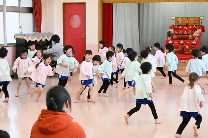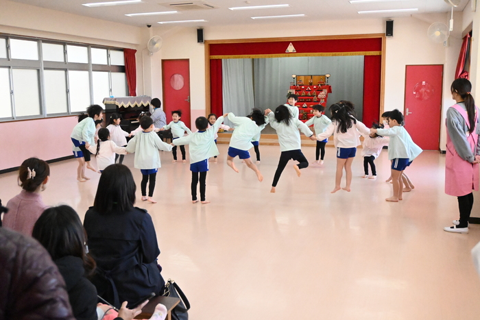 先日、正課で行っているリトミックの保護者見学会を行いました。 子どもたちは、講師の先生のピアノの音に合わせて元気いっぱいに体を動かしたり、 音が止まったらピタッと止まったりと、楽しみながらリズムを感じ取っていました。 日頃の活動の中で、音楽に親しみながら集中力や表現力を育んでいる様子を、 保護者の皆さまにもご覧いただけたことと思います。 | ||