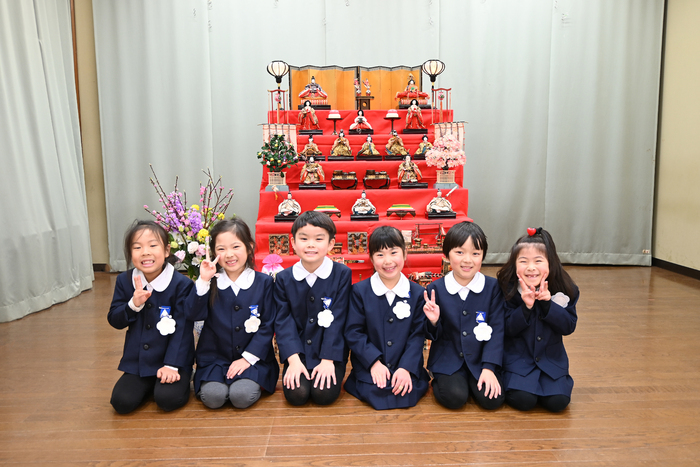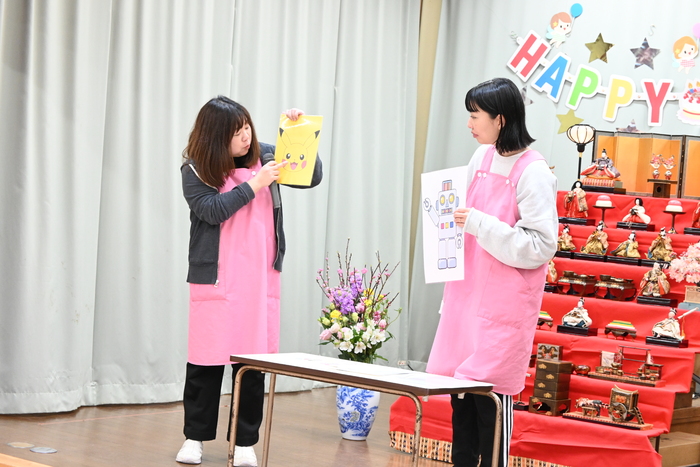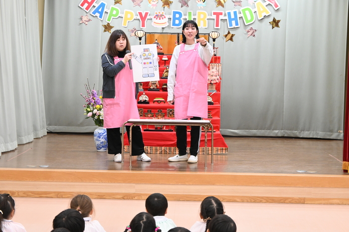 3月生まれのお友だちのお誕生日会と、ひなまつりをホールで行いました。 舞台には立派なひな飾りが飾られ、みんなで「うれしいひなまつり」の歌を元気にうたいました。 先生たちからの出し物では、ロボットの絵にクレヨンを渡すと、クレヨンの色と同じ色のキャラクターが登場! 黄色のクレヨンを渡すとピカチュウが現れるなど、次々と出てくるキャラクターに子どもたちは大喜びでした。 お誕生日のお友だちは先生に名前を呼ばれて舞台に上がり、王冠とお誕生日カードを受け取りました。 最後には、ホールにいる園児みんなで「お誕生日の歌」を歌い、おめでとうの言葉を届けました。 | ||