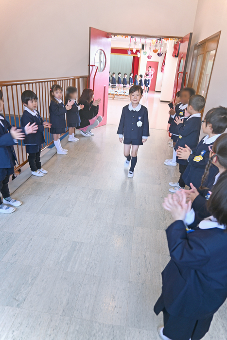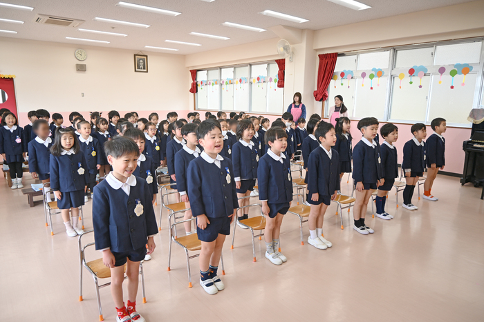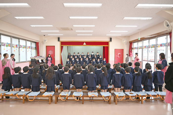 本日、幼稚園2階ホールで3学期の終業式を行いました。 明日卒園式を迎える年長組さんへ、年少組と年中組の子どもたちが心をこめて 「卒園生を送るうた」をプレゼントしました。 年長組の子どもたちからも、年少組と年中組の子どもたちへ歌のプレゼントをしました。 式のあとには、ホール前から1階までの通路で年少組と年中組のみんなが拍手でお見送りし、 あたたかい雰囲気の中でお別れのひとときを過ごしました。 | ||