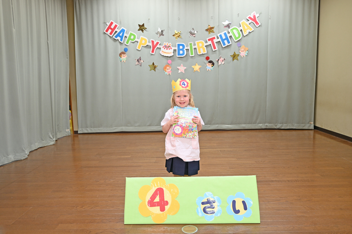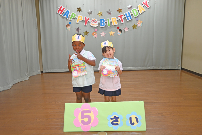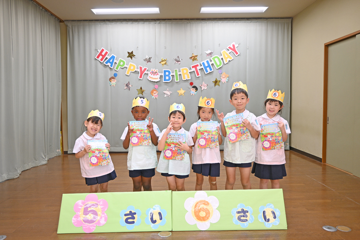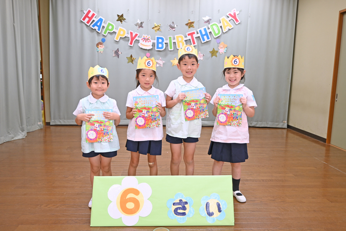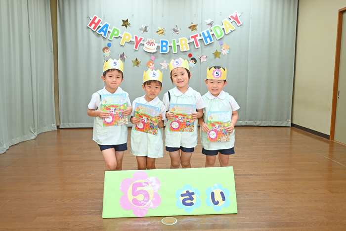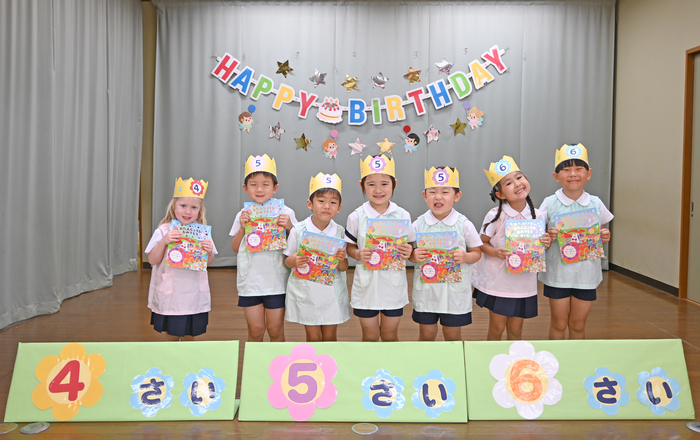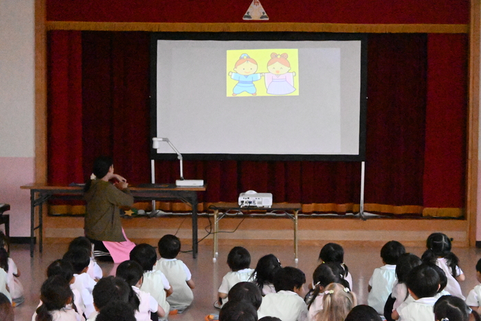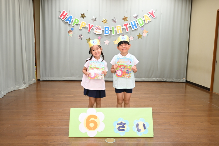 プロジェクターを使用し、先生たちによる七夕の紙芝居の読み聞かせを行いました。 子どもたちは物語の世界を楽しみながら参加していました。 お誕生日を迎えた子どもたちは、みんなからお祝いしてもらい、とても嬉しそうな笑顔を 見せてくれました。 | ||