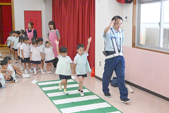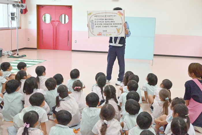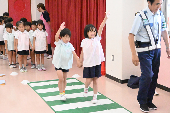 幼稚園の2階ホールにて、成城警察署交通課の警察官の方をお招きし、交通安全指導を実施しました。 プロジェクターを使用した学習では、道路の渡り方や駐車場でのお約束などについて 分かりやすく教えていただきました。 また、ホール内に設置した模擬横断歩道と信号機を使い、横断歩道の正しい渡り方や 信号の確認方法を実際に体験しました。 子どもたちは真剣に話を聞き、積極的に取り組む姿が見られました。 | ||