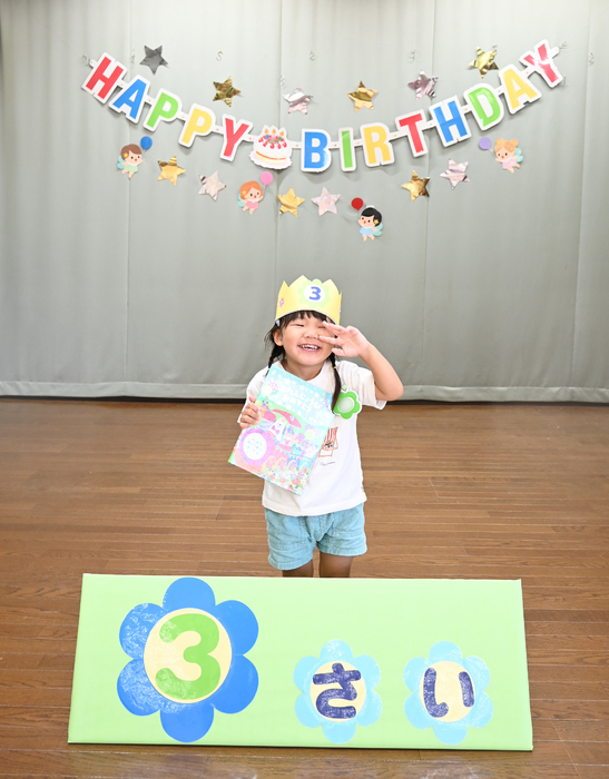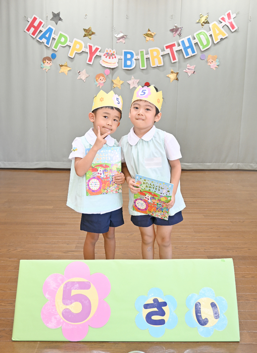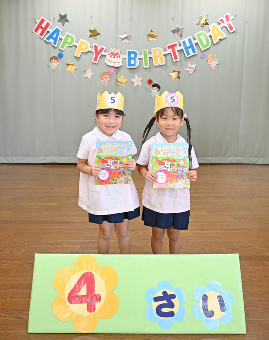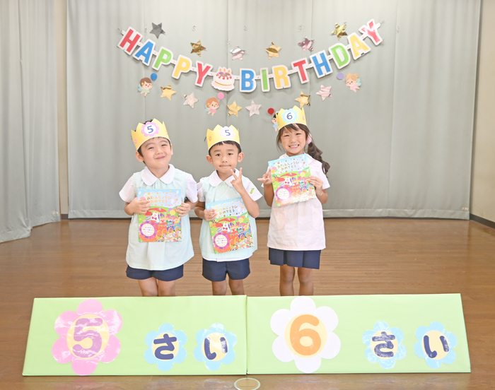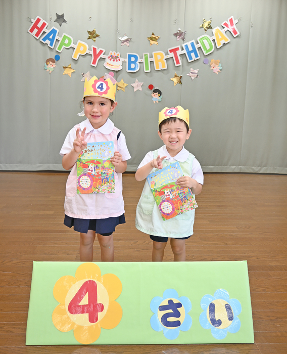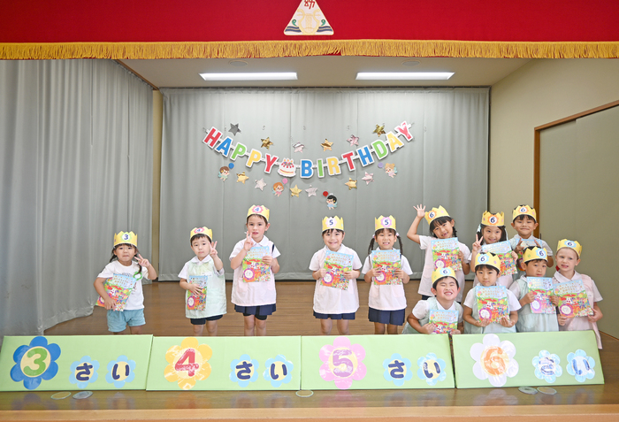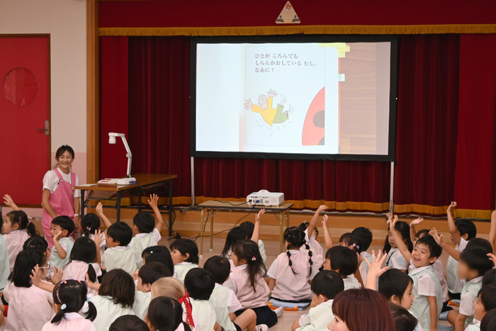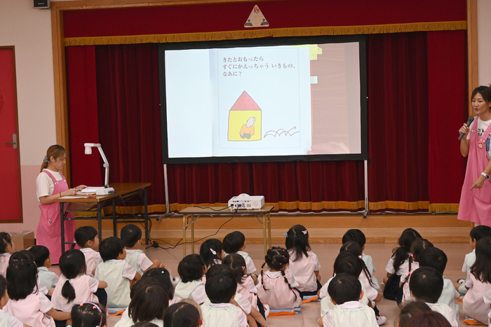 プロジェクターを使用し、先生たちが なぞなぞの本の読み聞かせを行いました。 子どもたちは大きな手を上げて答えを言い楽しそうに参加していました。 お誕生日を迎えた子どもたちは、みんなからお祝いしてもらい、とても嬉しそうな笑顔を 見せてくれました。 | ||