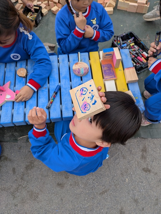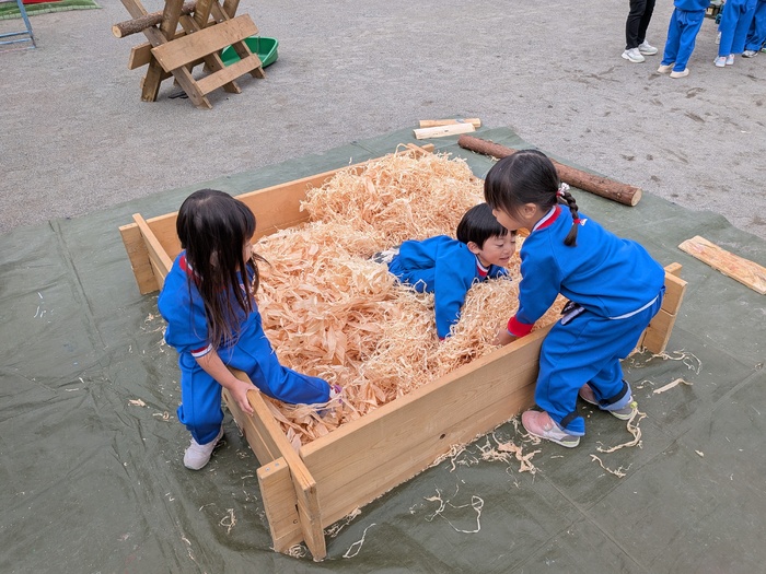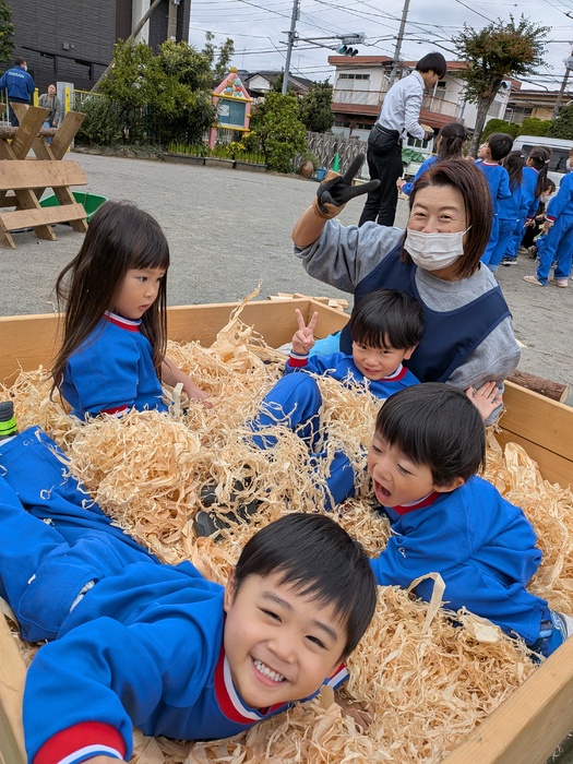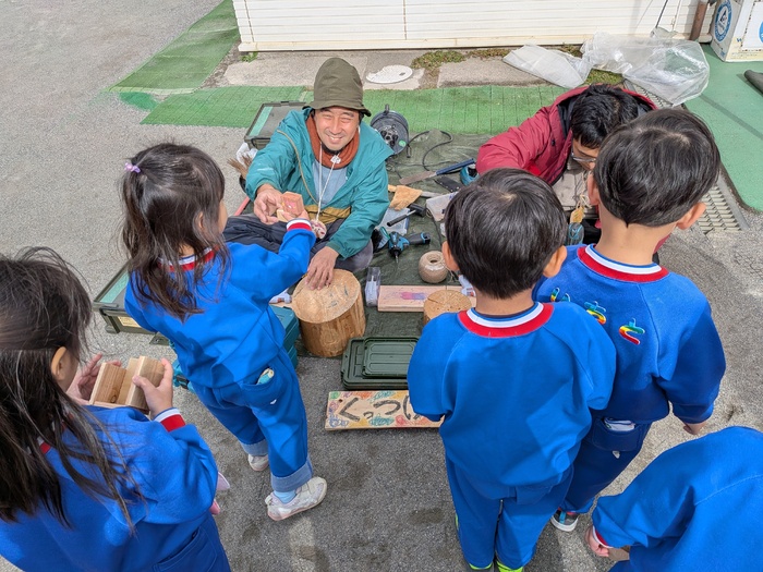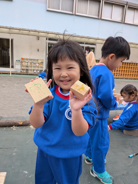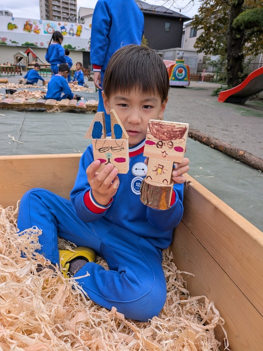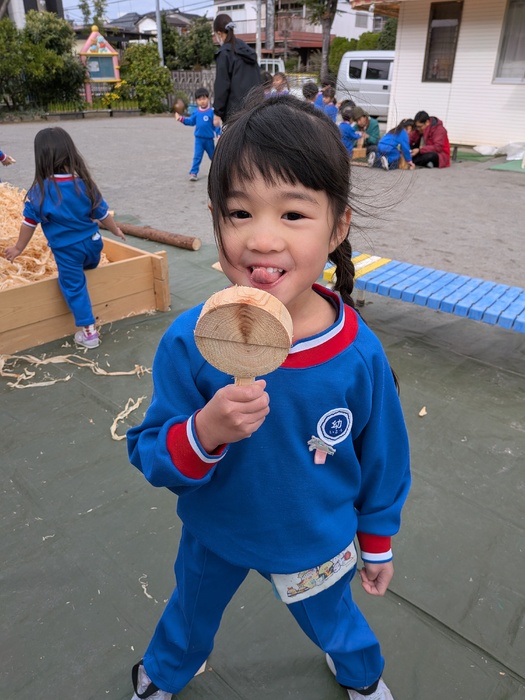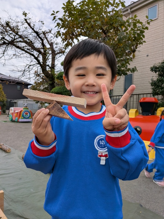 11月11日(火)奥多摩から『森と市庭』さんの『まさお君』が、木材を持って遊びに来てくれましたよ♪今年度は、園庭で秋の風を感じながら、木材に触れ、物造りや発散を楽しめましたよ♪