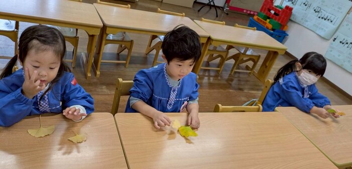 園庭にもある『イチョウ』さんの葉っぱ、変身する前は何色だったかな?