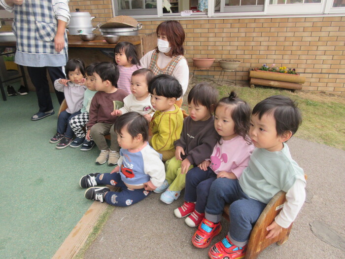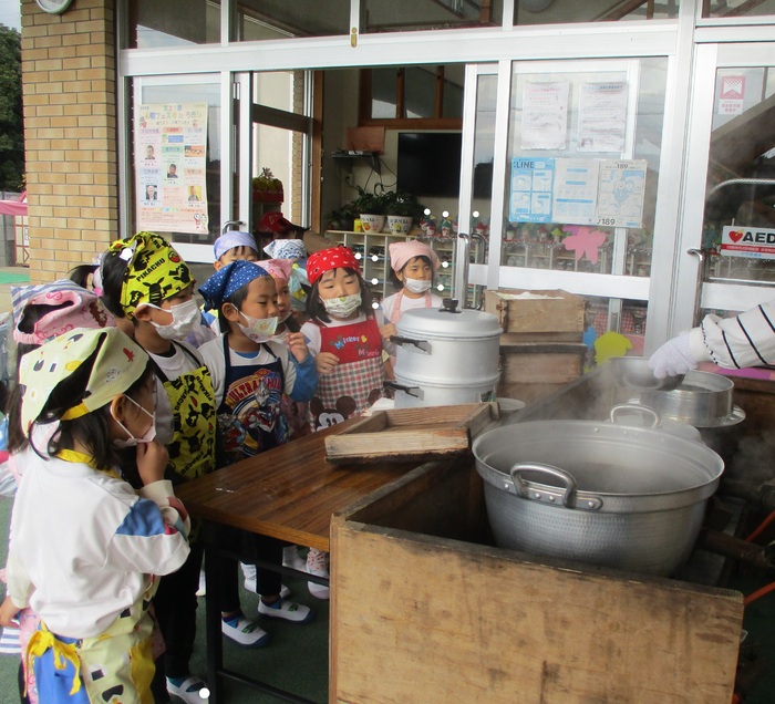 ★ぞうぐみ★もち米を蒸している様子を見学しています!