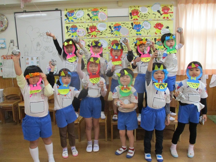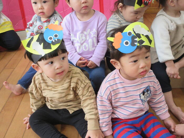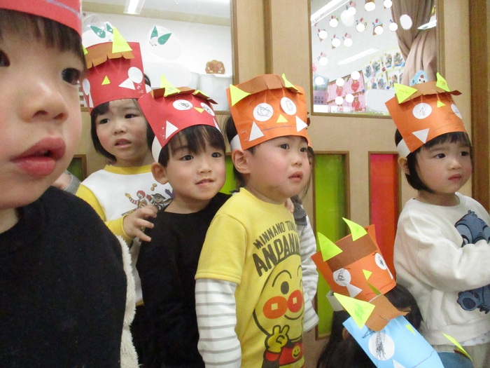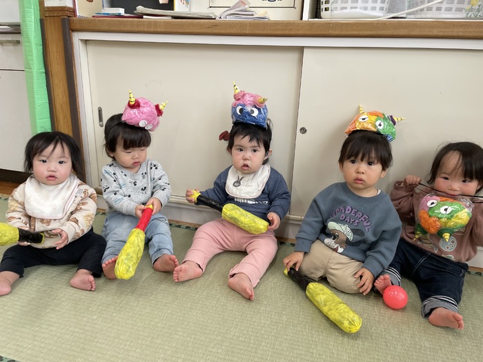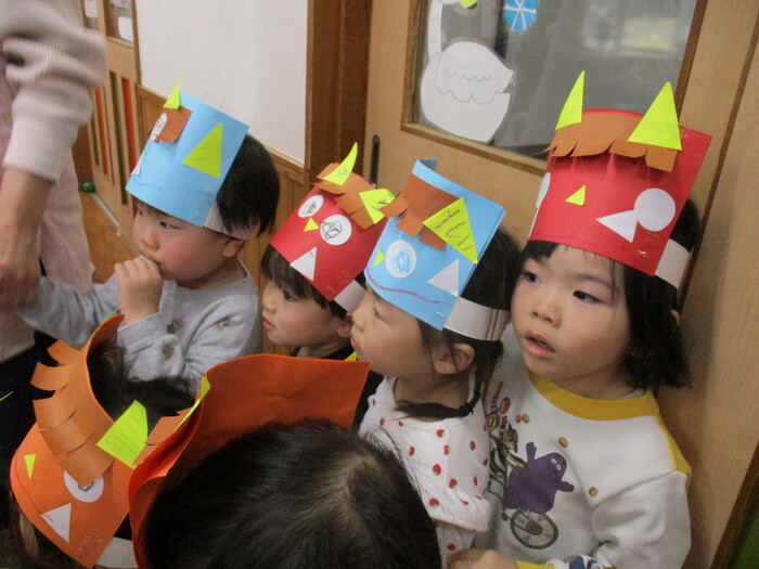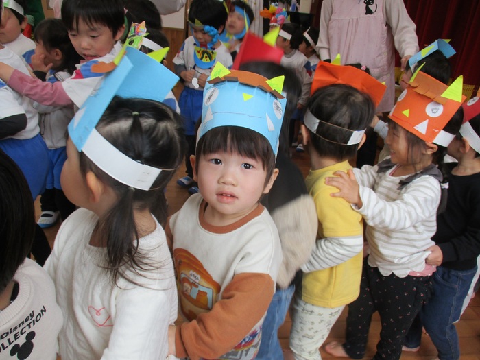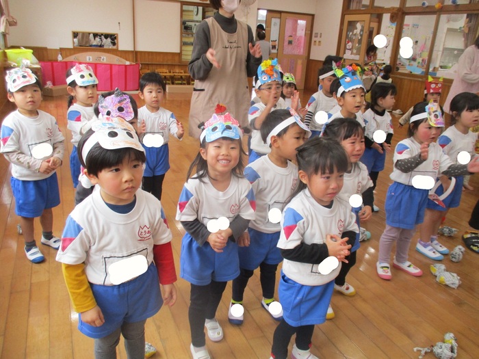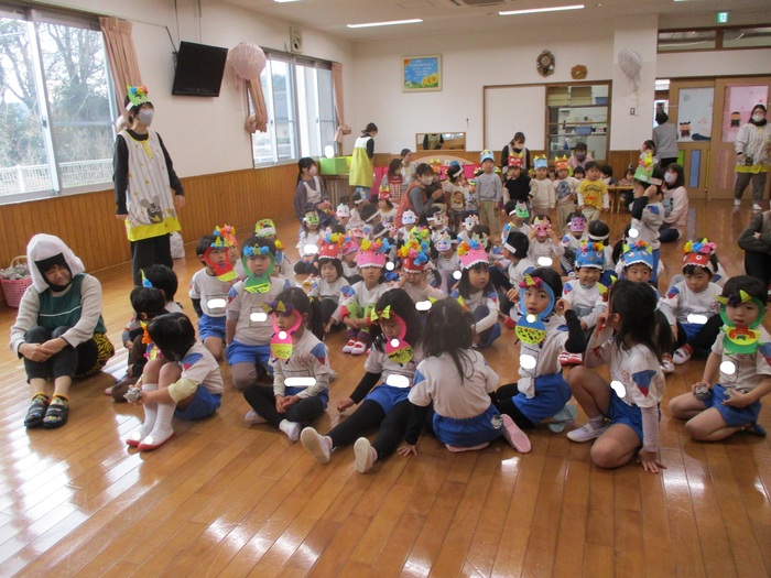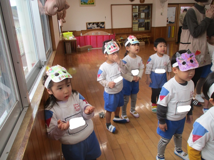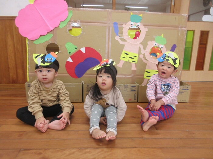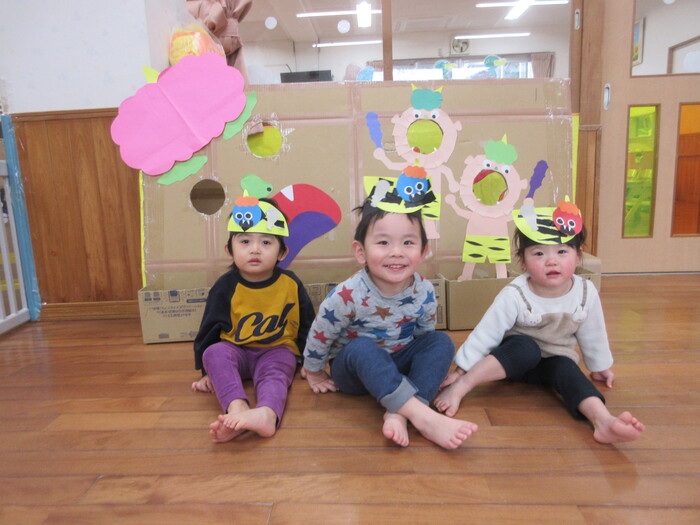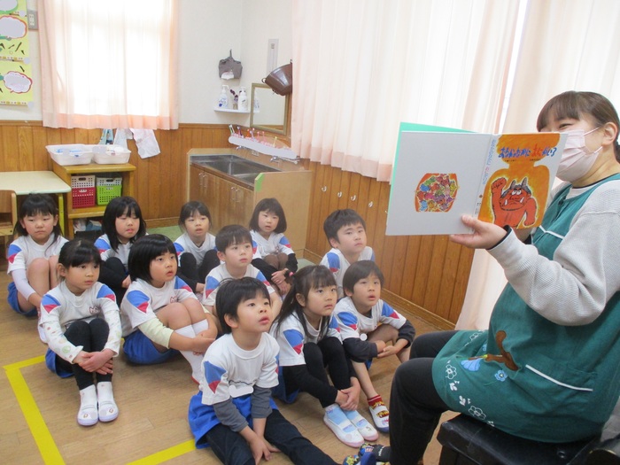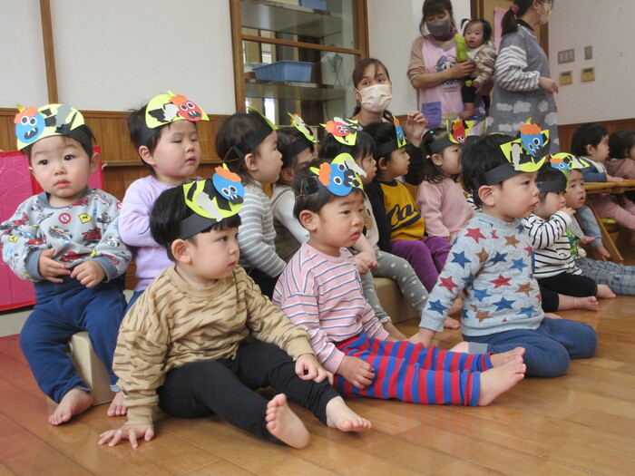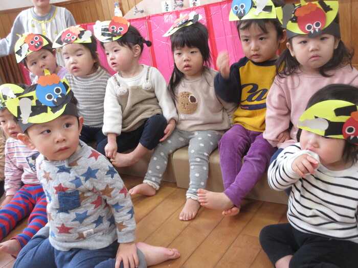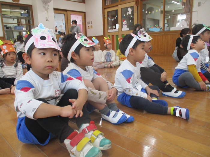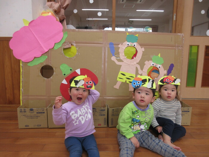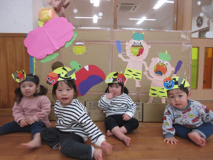 節分の集会では、歌を歌ったり紙芝居を見たりしました☆