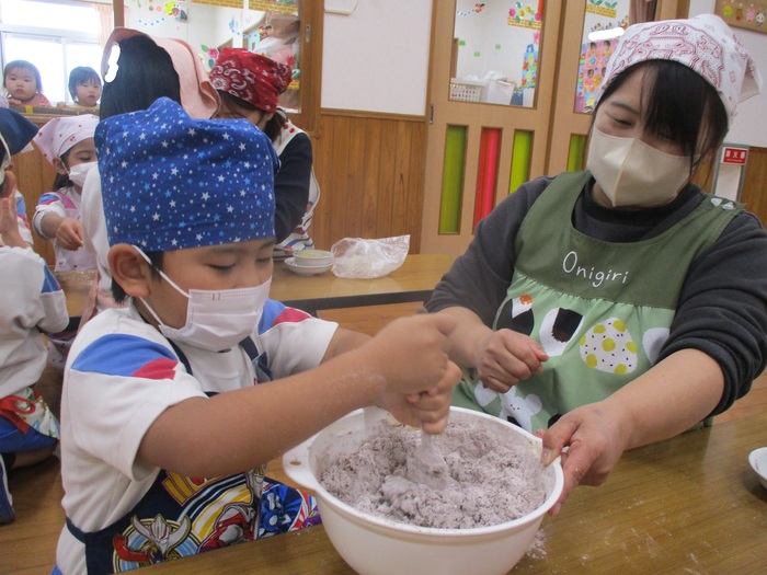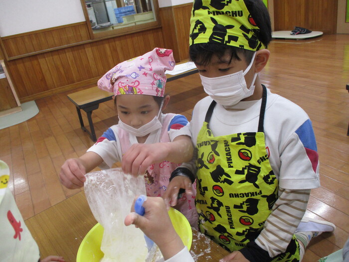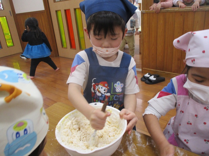 粉を入れて混ぜました!プレーン生地とココア生地を作りました!