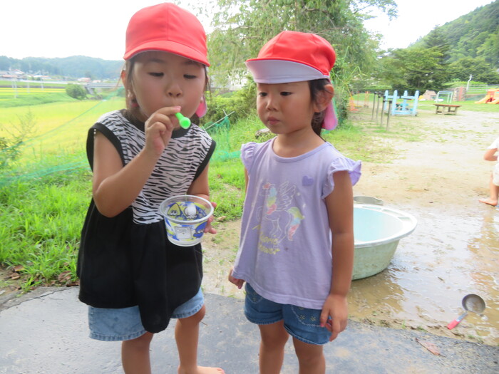 大きいしゃぼんだまや、ちいさいしゃぼんだまにワクワクの子ども達です。 | ||