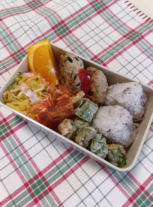 メニュー しらすゆかりおにぎり 和風ハンバーグ そうめん瓜の酢の物 じゃがいものガレット コロコロオクラ オレンジ | ||