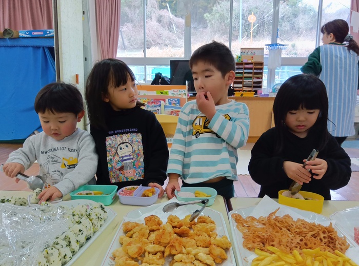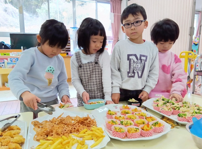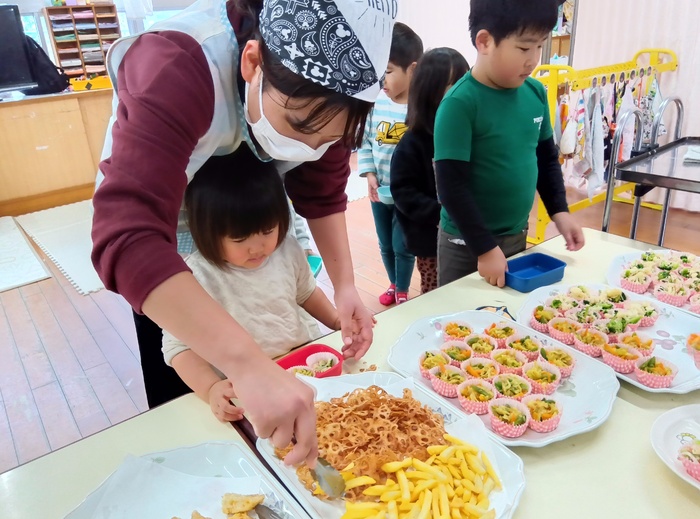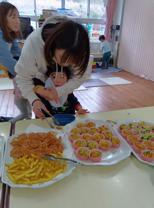 ~メニュー~ 🍙大根菜おにぎり 🐔鶏天 🥔フライドポテト&れんこんチップス 🥦ブロッコリーとカリフラワーの酢味噌和え 🍛切り干し大根のツナカレー煮 揚げ物は圧倒的人気でしたが、今回は大根菜おにぎりも大人気! 「おいしい~!」「次は〇〇おかわりしよ~!」「お腹いっぱい!ポンポン!ね♡〇〇ちゃん😆♡」 と、わいわい言いながらもりもり食べてあっという間になくなりました🤣✨ | ||