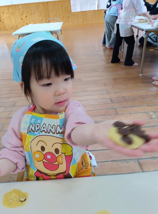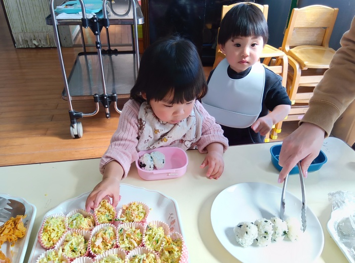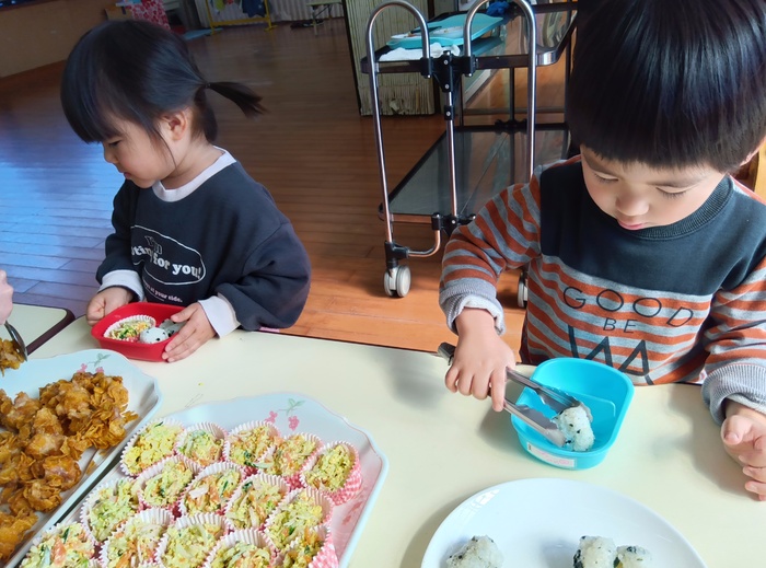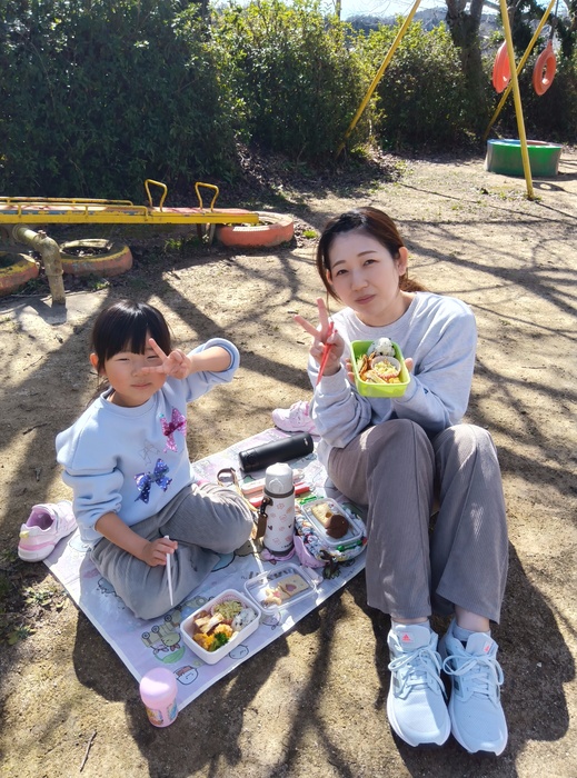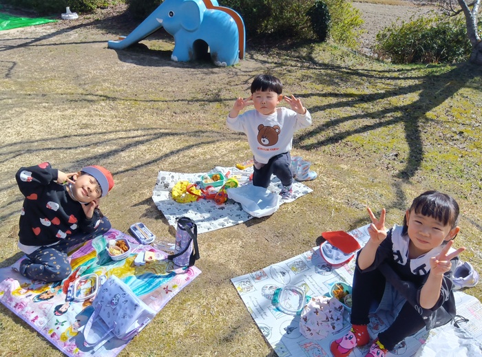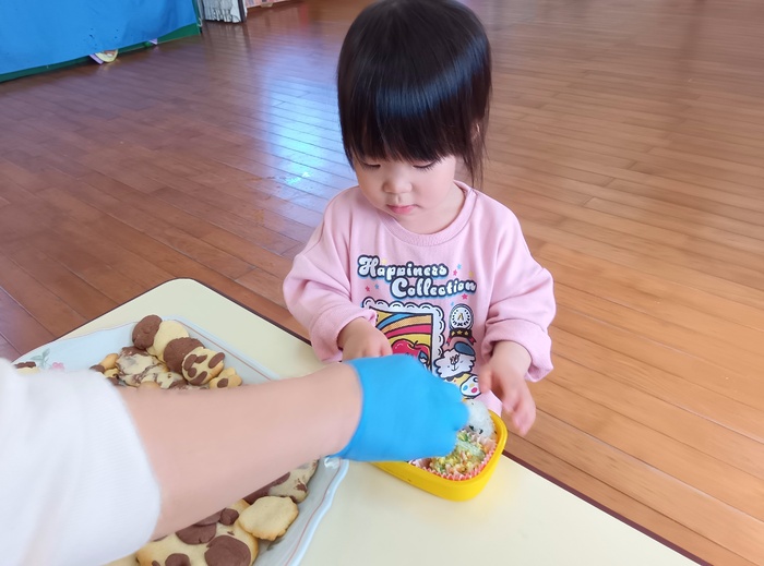 青空ランチ 自分でお弁当に食材を詰めて、デザートには、自分たちで作ったクッキーを食べました💗 当日は、ポカポカ陽気で、青空も見え、戸外でみんなで食べました!! | ||