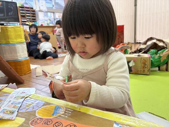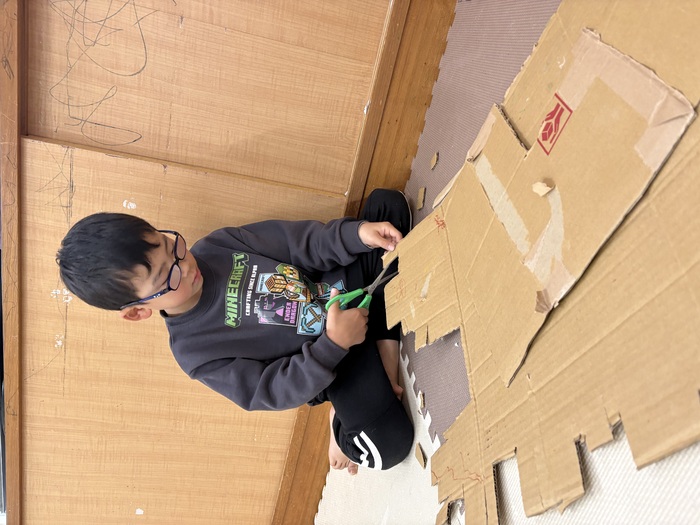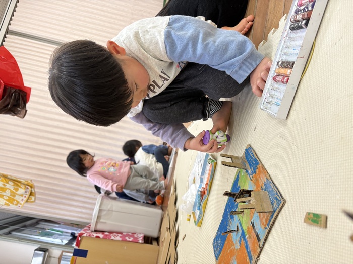 ダンスを踊っている横では黙々と製作をする男の子チーム! 一枚の段ボールとクレヨンで あっという間に素敵なものに変身! この後とあるゲームの専門用語が飛び交う中に ゲラゲラと笑い声もとまりませんでした(笑)! | ||