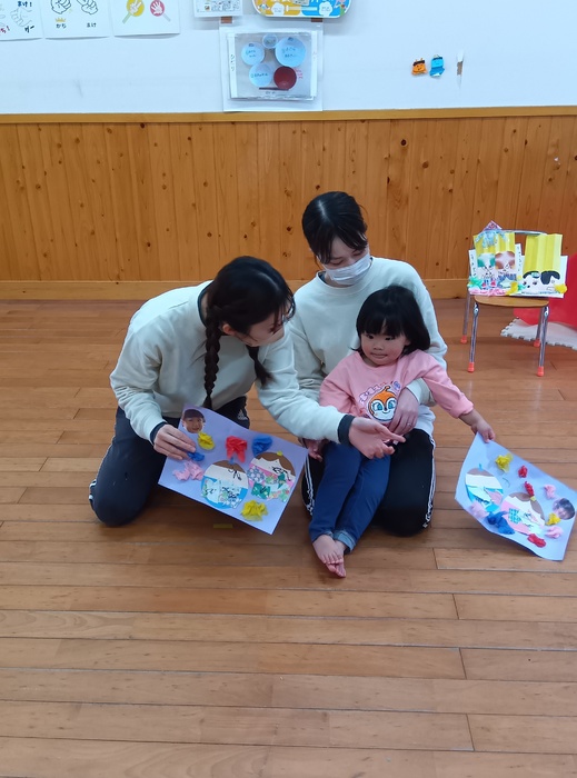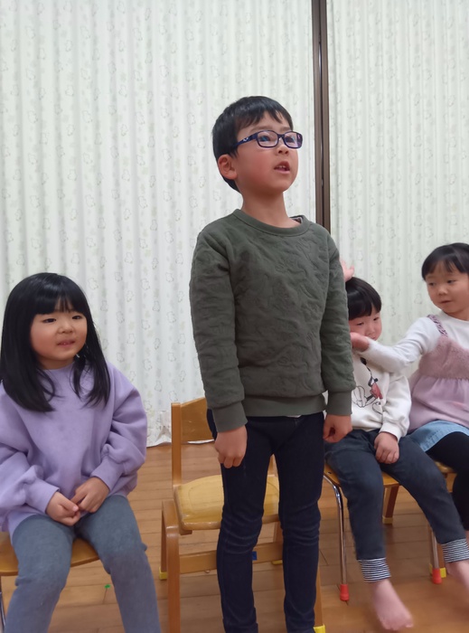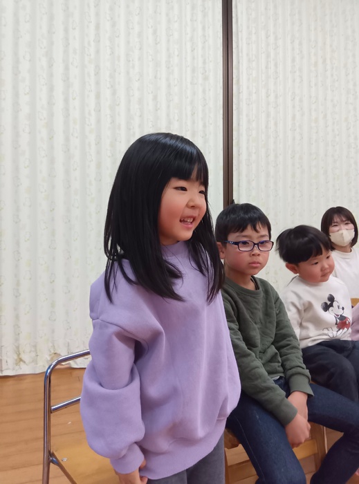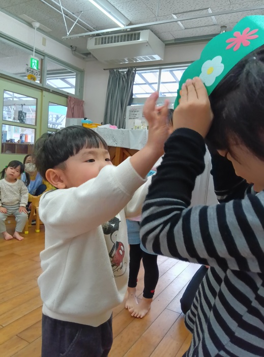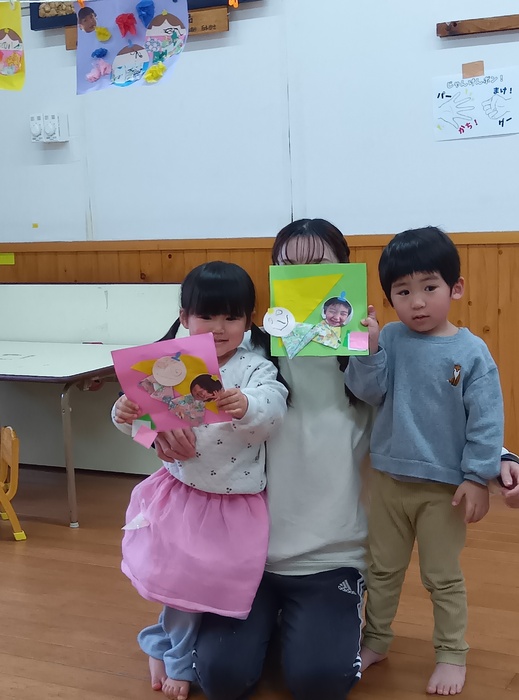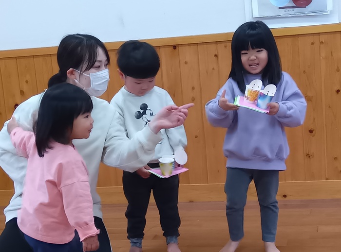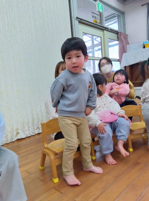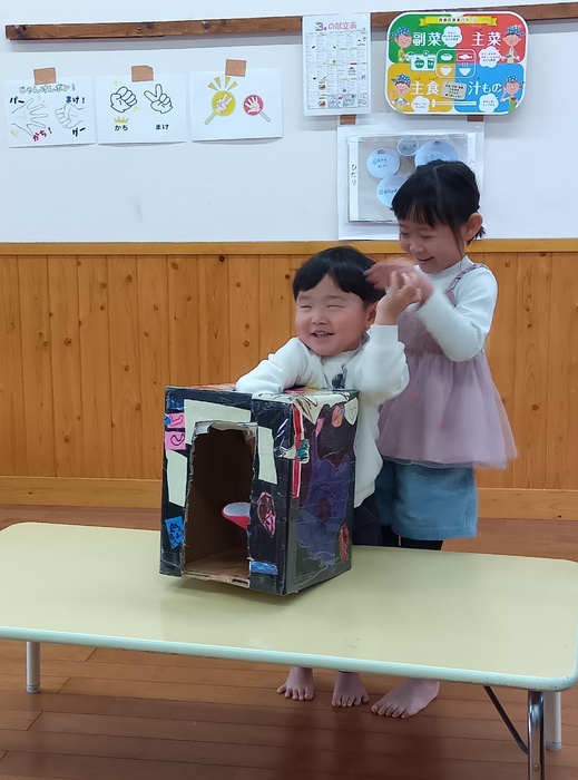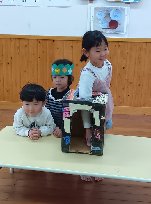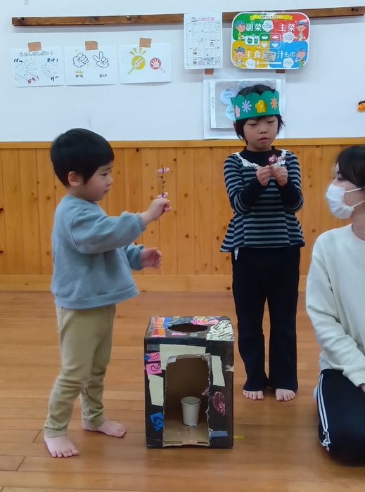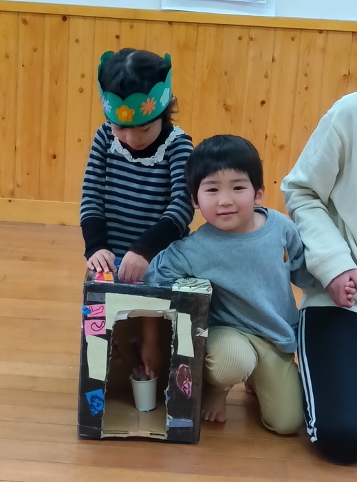 お楽しみは・・・!? 「はこのなかみはなんでしょう!?」 今回は誕生児が「問題を出す人になってみんなにクイズしたい!」とのことで ひな祭りや保育園にちなんだ何でしょうクイズをしました。 見せ方や伝え方を自分なりに工夫しながら、少しドキドキしたけど 大成功💗だったようです。 触った時の真剣な表情、笑い合う表情 いろいろな表情が見られて楽しいひと時でした🥰 | ||