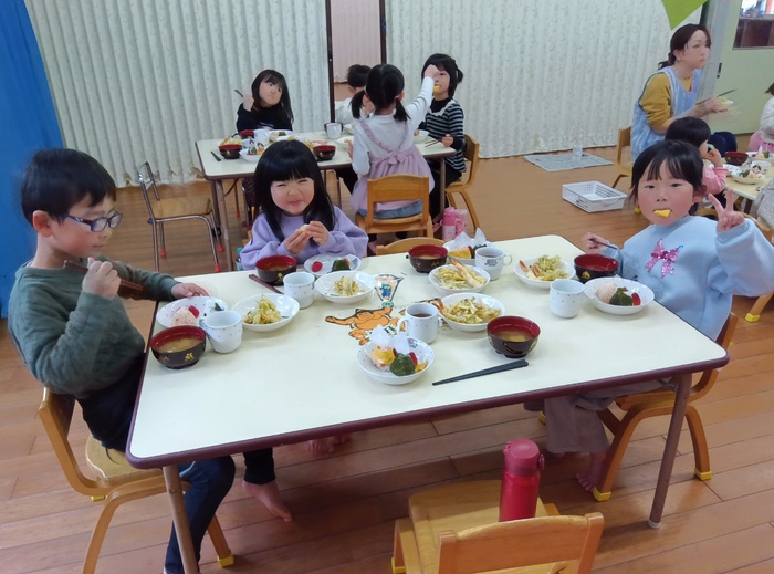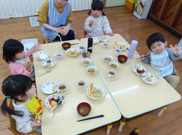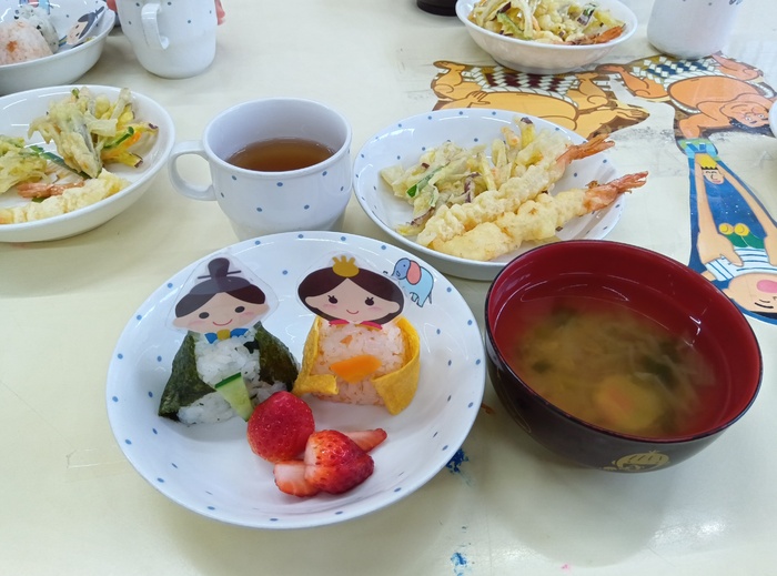 ~🎎ひな祭り給食💗~ 🍙ひなにんぎょうおにぎり (さけ・わかめ) 🥕野菜の天ぷら 🦐えびの天ぷら 🌸花麩のすましじる 💛ゼリー | ||