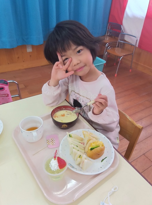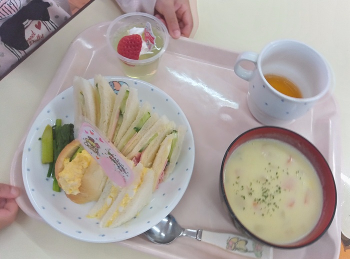 ~誕生日プレート💗~ 🍞いろいろな種類のサンドイッチ ☆アスパラガス(誕生児のおじいちゃんおばあちゃんからいただきました!) ☆カレーチャウダー ☆ゼリー ~おやつ~ プリン🍮💗 | ||