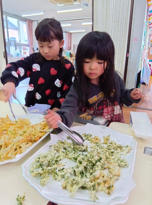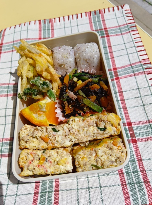 ~青空ランチメニュー~ 🍙ゆかりおにぎり 🌟彩り豆腐 🥕野菜のかきあげ 🍃よもぎの天ぷら 🌟ひじきの華風和え 🍊オレンジ | ||