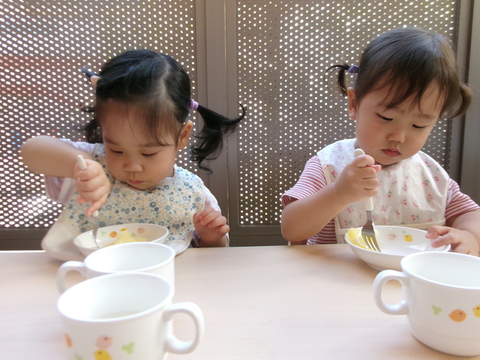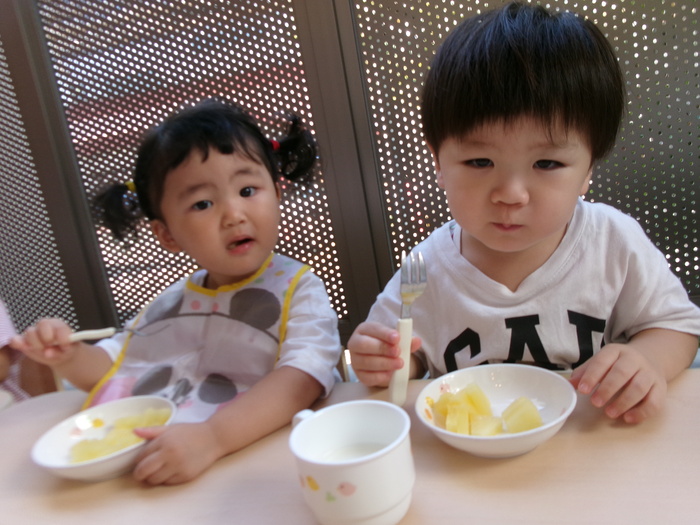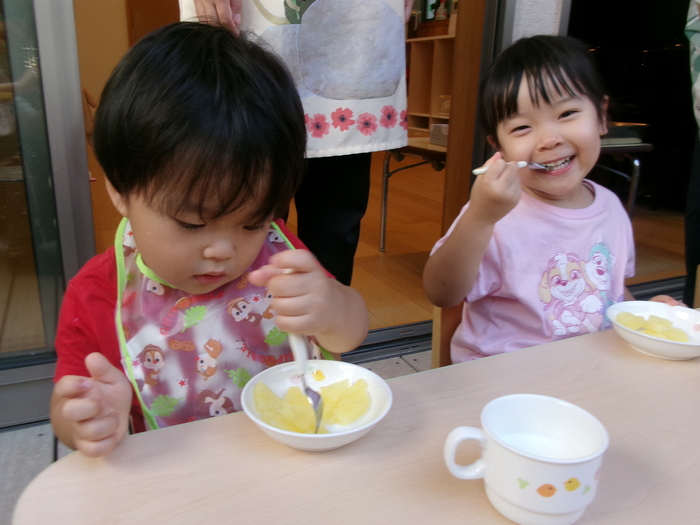 暑い夏が過ぎ、秋の風が気持ちいい季節になりました! 秋空の下、テラスで朝のおやつを食べました。 真っ青の空に、雲や飛行機を見つけて喜ぶ子ども達! 風が吹くと「気持ちいいね!」とお話をしたり、木々が揺れるカサカサの音に気付いたり いつも食べているパインや牛乳の味も、より美味しく感じているようでした! | ||