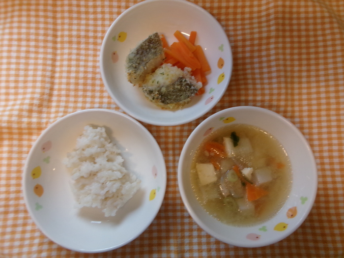 昼食 *魚のパン粉焼き *にんじんの甘煮 *豚汁 *ごはん | ||