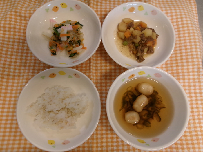 昼食 *肉じゃが *ほうれん草の中華和え *清汁 *ごはん | ||