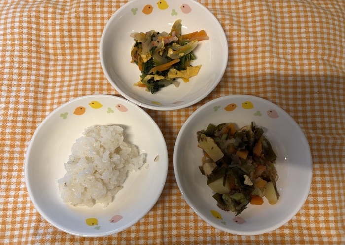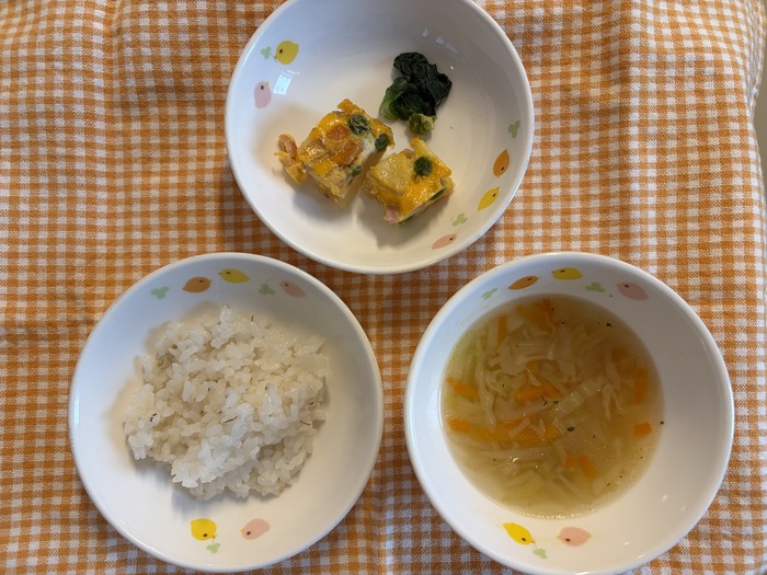 昼食 *ウィンナーのオムレット *チキンスープ *サラダ菜 *ごはん | ||