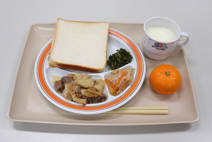 ・大根のあちゃら煮 ・えのきの酢の物 ・ジャム付きパン ・大根の葉の煮物 ・スキムミルク ・みかん | ||