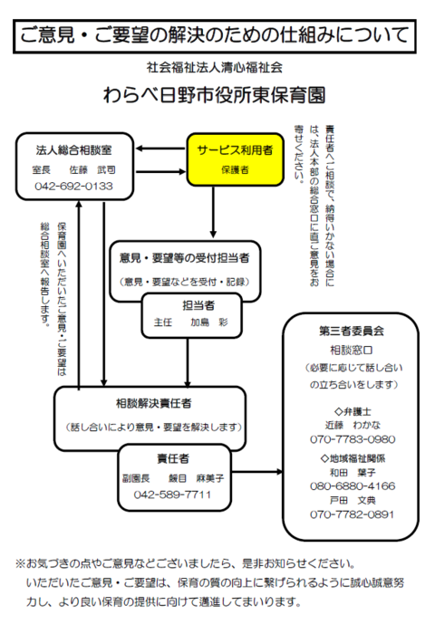 保育園のことで気づいたこと等は、遠慮なくお伝えいただきたいと思います。 ご意見をいただくときは、職員誰でも承りますが、担当者・責任者をそれぞれ設けてありますので、下記の通りお知らせいたします。 また、正面玄関にご意見箱を設置しておりますので、そちらも是非ご活用ください。 | ||