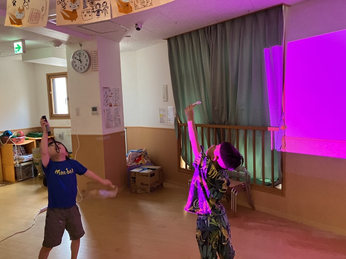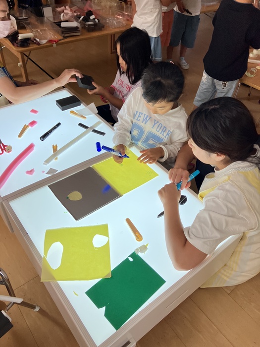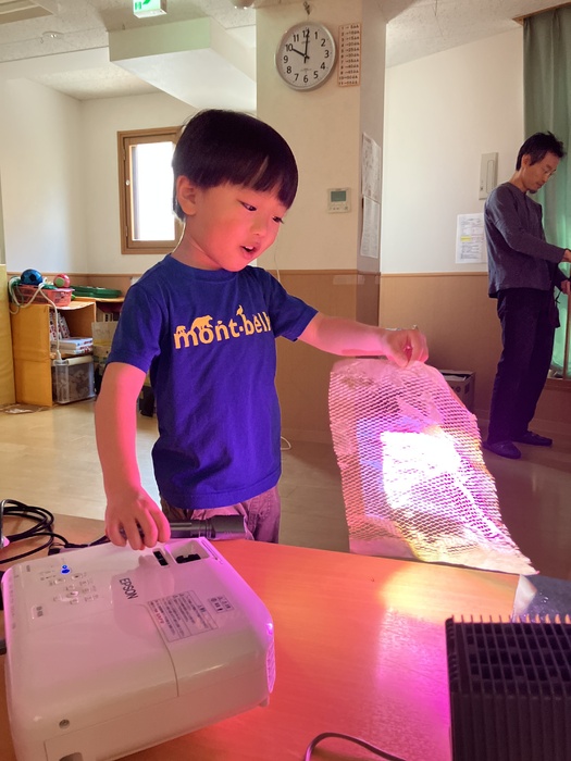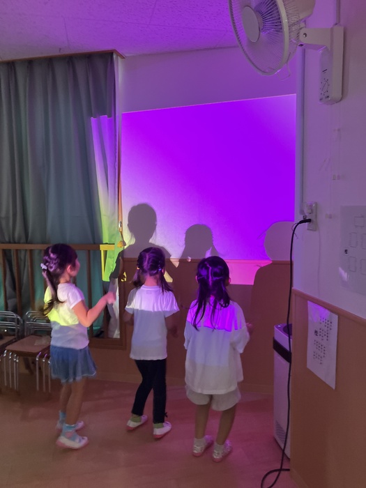 4歳児ゆり組・5歳児さくら組 8月 「光と遊ぶ」 楽しみにしていた「あそび大学」の日。 光をテーマとして、プロジェクターや光る机を使って遊びました。プロジェクターの前に立つと、自分の影がスクリーンに映ることを発見した子どもたち。 「わぁ!私がいる!」と大興奮で、ずっとジャンプを繰り返し影の動きを楽しんでいました。 またミラー加工された紙に光をあててみると、光が跳ね返り、天井に映し出されることを発見!「えっ!?光が上に行った!」と目がまんまるに!紙の角度を変えると光の反射の位置も変わることにも気付き、「次はどこに出るかな?」と天井に走る光を追いかけ期待に胸を膨らませていました!光の不思議に出会った子どもたち。反射という現象を遊びの中で自然に見つけ、夢中でその変化を楽しんでいました。 | ||