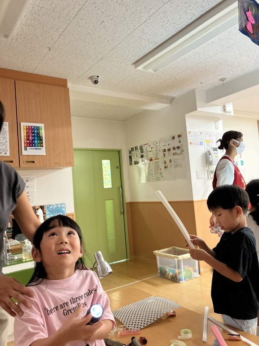 4歳児ゆり組・5歳児さくら組 9月 「やってみよう!!~光と親しむ~」 待ちに待ったあそび大学!! みんなとても楽しみにしていました。前回はなかった町工場から出た廃材を見た子どもたちは目をキラキラ させていました。 明かりを落とし、プロジェクターや光るテーブル、手持ちの懐中電灯などを使い「光あそび」を楽しみました。 たくさんの穴が開いている厚紙に光を当ててみると…厚紙の角度や光の当て方によって、見え方が変わることに気づき「こうやって光を当てると穴がたくさん」など、光の不思議に触れ、興味深く観察していました。 造形あそびが大好きな子どもたちは、様々な素材を組み合わせて「パソコン」「エアホーン」など思い思いにつくり楽しんでいました。 | ||
