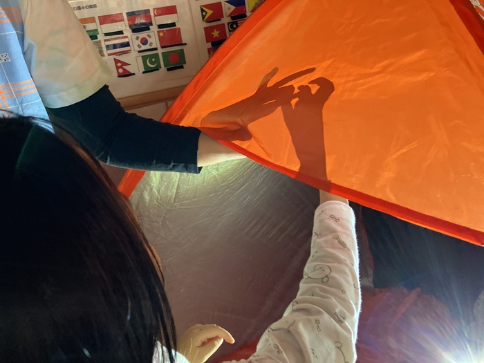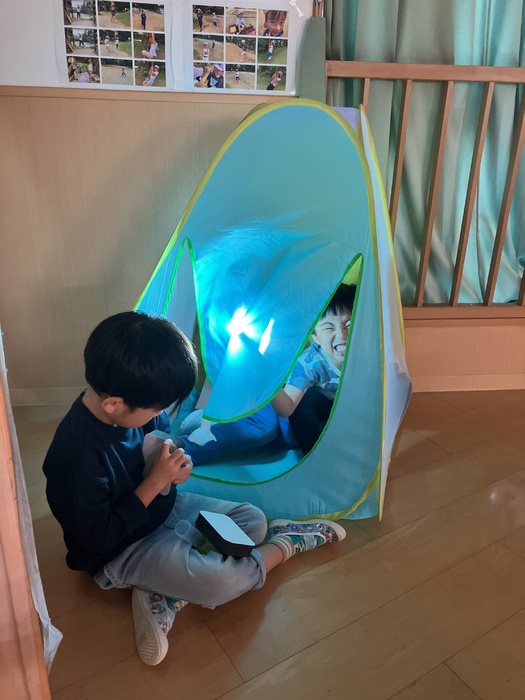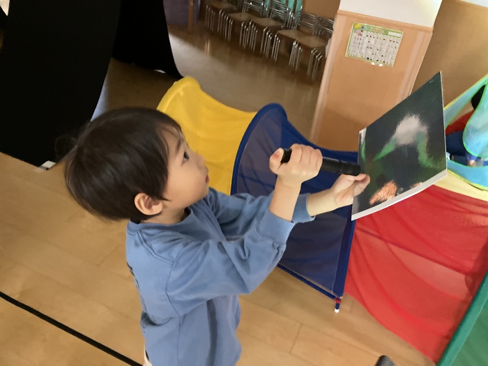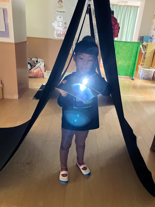 4歳児ゆり組・5歳児さくら組 「もっと光を感じよう!」 今回のあそび大学は普段よりもっとたくさん光を感じることができるように、暗い環境を作ったり用意しました。テントや布、トンネルの中に入るだけでウキウキ・わくわくしていた子どもたちです。 今回は影や反射により興味を持ち、じっくり探求していました。 真剣な表情、笑顔、様々な姿を見ることができました。 | ||