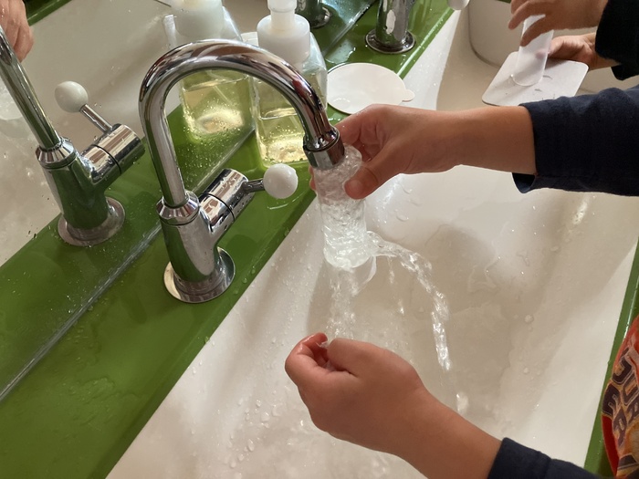 5歳児 さくら組 「色水あそび」 前年度まで様々な造形活動を経験してきた子どもたち。これまでは用意された色の絵の具を使っていましたが、初めての試みとして赤・青・黄・白の4色から自分で選んで混ぜ、色を作ることに挑戦しました。色づくりのヒントとして、何色と何色を混ぜると目指す色ができるか、図で示した「色水カード」を各々に渡して活動が始まりました。 プラカップに水をくみ、絵の具をつけた筆を差し込むと、広がるきれいな色に「わあ~!」と歓声が上がります。たった4色の絵の具から様々な色が生まれる不思議さ・面白さに夢中になっていました。 「この色ができたよ!」と保育者に報告すると、色水カードの該当色に「できた」の印がもらえます。印をたくさんもらいたい気持ちも手伝って、時間がきても「もっとやりたい!」と手が止まりませんでした。 | ||