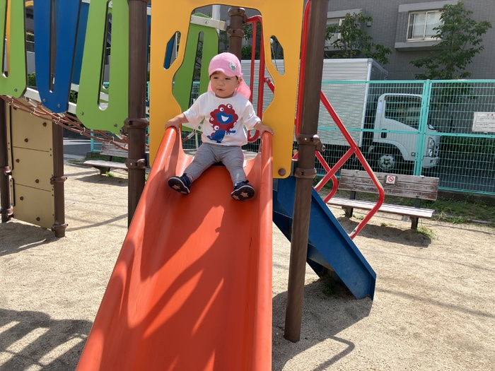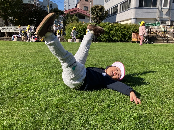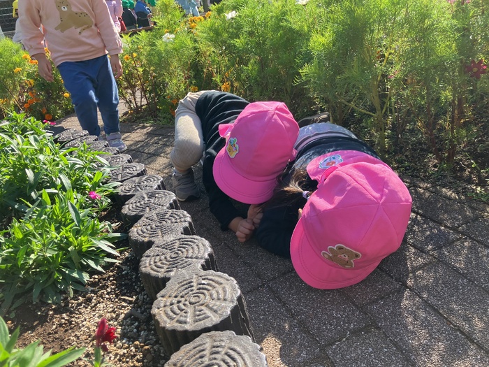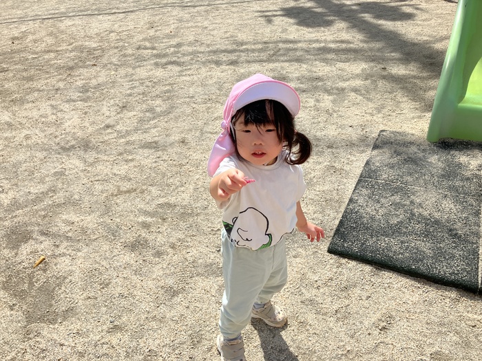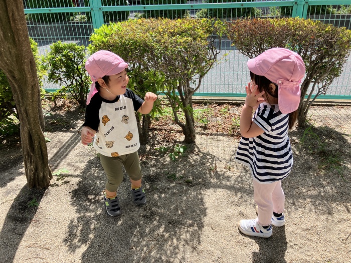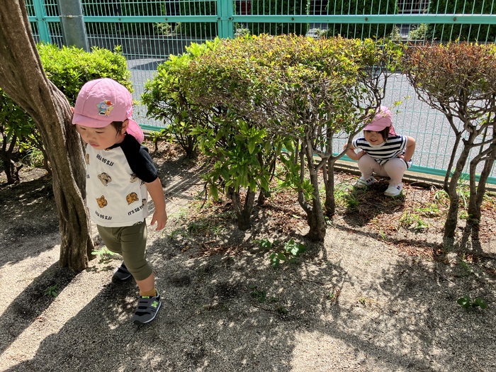 1歳児たんぽぽ組 9月 暑さも和らぎ、お散歩が楽しめる季節になりました。 中之郷児童遊園では滑り台やスプリング遊具を繰り返し楽しんだり、走って体をたくさん動かすことを 楽しんでいました。 お友だちとの関わりややり取りが更に増し「かくれんぼ」をする子どもたちもいました。 見つからないように隠れてみるものの…「見つけて!」と言わんばかりにお友だちの目の前に出たり「みーつけた」の声にとっても嬉しそうな表情を見せる子どもたちでした。 | ||