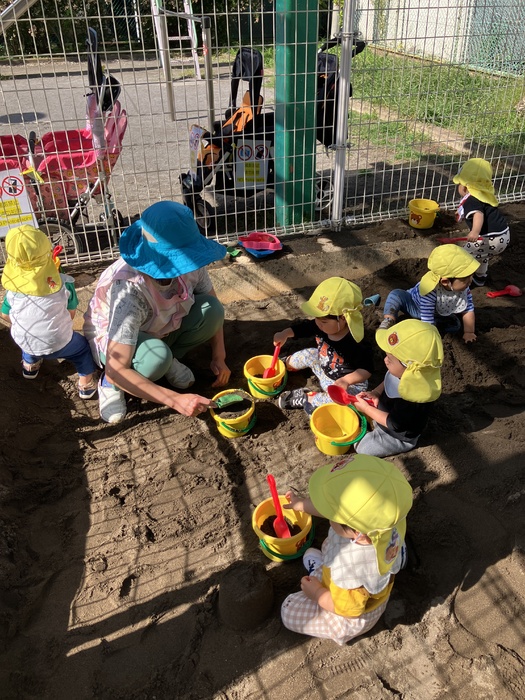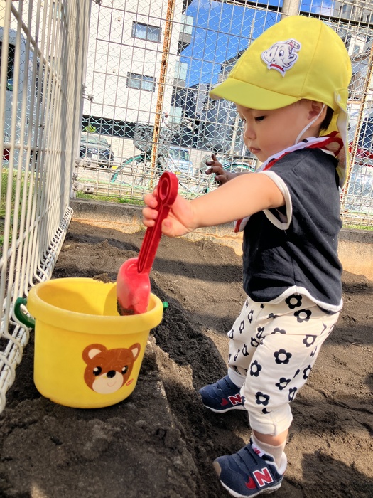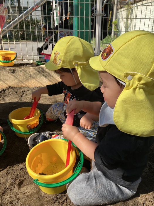 0歳児すみれ組 10月 「砂場遊び」 少し前までは砂に触れることに抵抗を示す子もいましたが、お友だちや保育者が楽しんでいる姿を見て 「やってみよう」という気持ちになれたようです。 今では手で砂の感触を楽しんだり、シャベルを用いてバケツにたくさんの砂を入れたり思う存分、楽しんでいます!バケツにたっぷり入れた砂を「よいしょ!」と運ぶ姿はかわいらしさと共に成長を感じる時間です。 | ||
