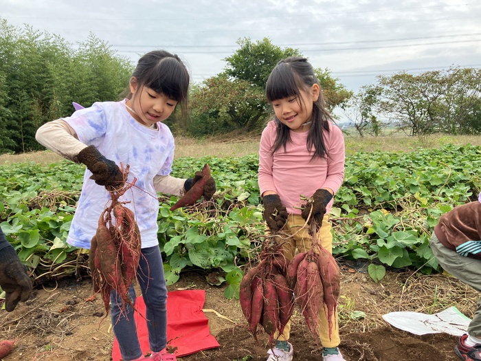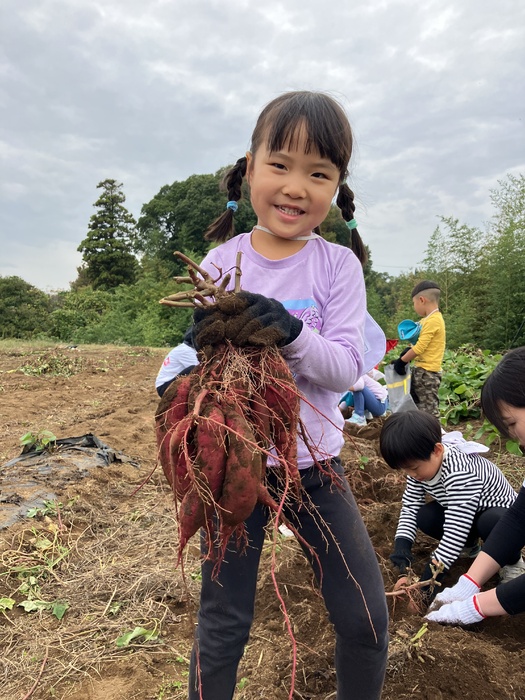 4・5歳児 「芋掘り遠足」 10月末、千葉県柏市まで芋掘りに行きました。 今年は豊作で「まだお芋が見えてる!」「見て見て!大きい!」と子どもたちも大喜び。 行きのバスの中ではお芋はどうやってできているのか?お芋の花ってどんな花?などさつまいもについてクイズを通して学びました。 小さなクラスや分園のお友だちの分もお芋掘りをがんばってくれました! | ||