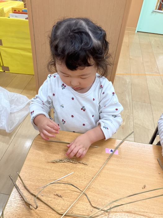 2歳児 ちゅうりっぷ組 11月 「ある日の生活」 保育園がお世話になっているお米屋さんから、稲をいただきました。 お米に関する絵本を見た後、稲や米に触れたりして、食生活に欠かせないお米について知りました。 この日は職場体験として2名の学生さんが保育士の仕事を体験しに来ていました。 学生さんも一緒に親水公園までお散歩に。 芝生に寝転がったり、かくれんぼをしたり、楽しい1日を過ごしました。 | ||