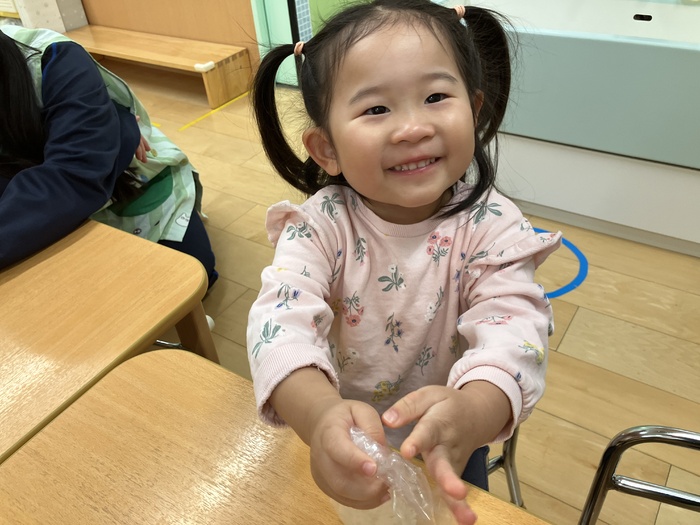 全クラス 「水遊び満喫!」 7月~9月中旬まで、テラスにて水遊びを楽しみました。 0歳児はひとりひとりのタライ、1歳児以上はお友だちと入るプールに入りました。 水鉄砲での的当てや、じょうろや水風船などの水遊びのおもちゃで遊んだり、お店やさんごっこを楽しむお友だちもいました。 今年度も安全に楽しい水遊びを経験できました。 | ||