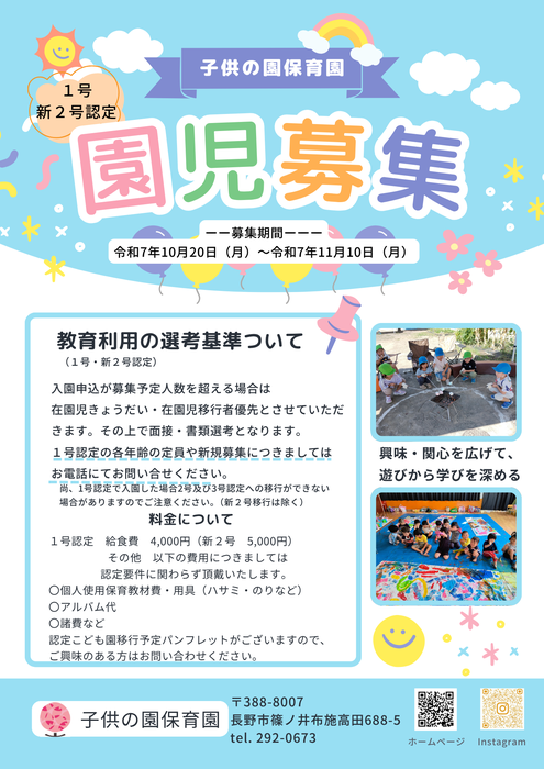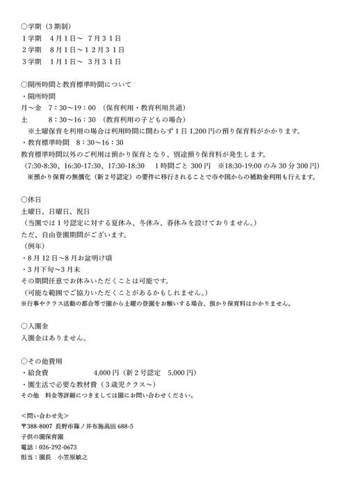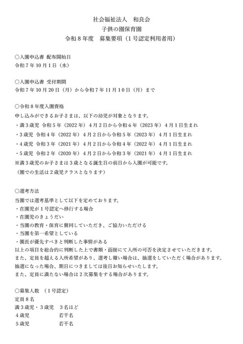 令和8年度より認定こども園への移行に伴い、1号認定児の募集を行います。 募集内容につきましては、画像のとおりです。 募集人数や対象年齢など、ご不明な点がございましたら、お電話にてお問い合わせください。 また、申込用紙は10月1日(水)より配布いたします。 | ||