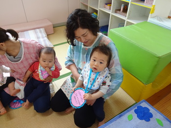 乳児さんはそれぞれの学年で行われます。 写真はひよこ組さんのお友だち。(一人だけ写真からはみ出てしまいました・・・苦笑) 乳児さんは、手作りの大っきなメダルです!・・・みんな、きょとんとしていましたね。「もう」1歳なんですよ。 ちゅうりっぷ組はおやつの関係で写真が撮れませんでした。ごめんなさい。 | ||