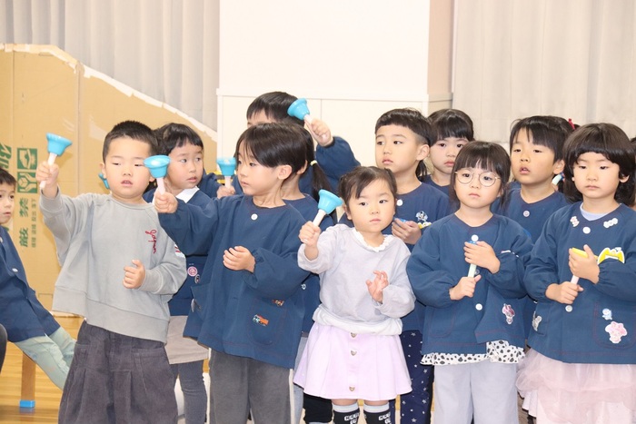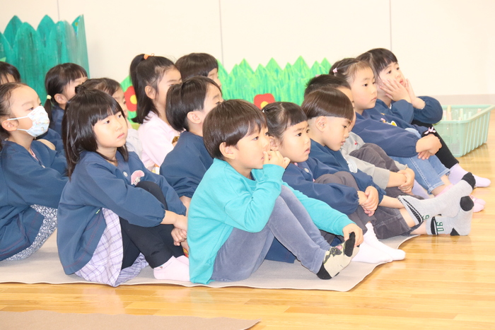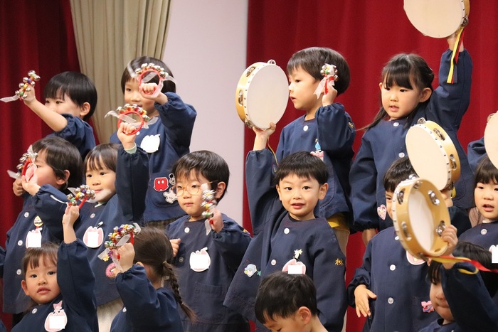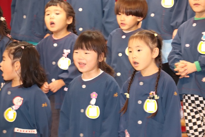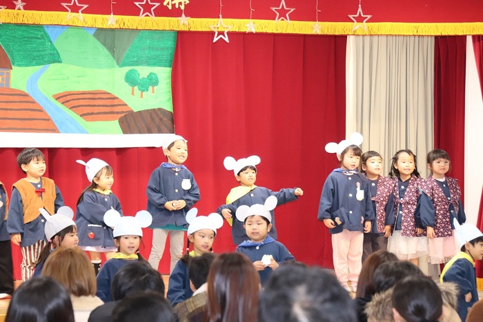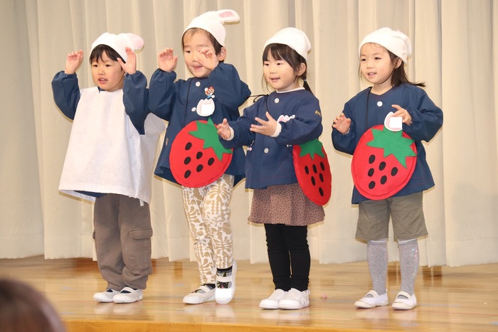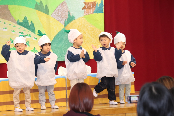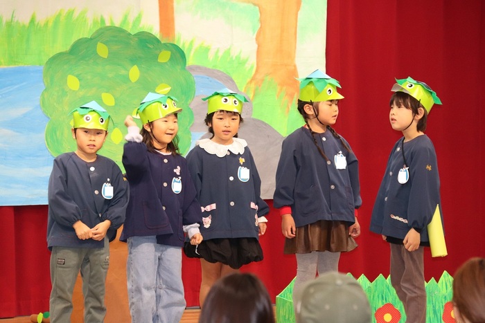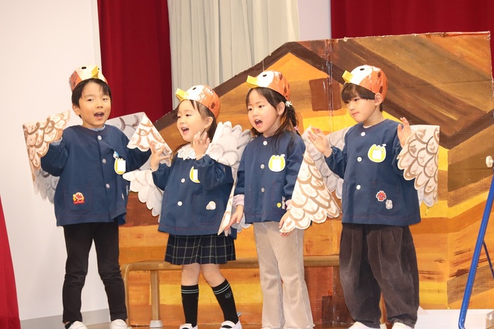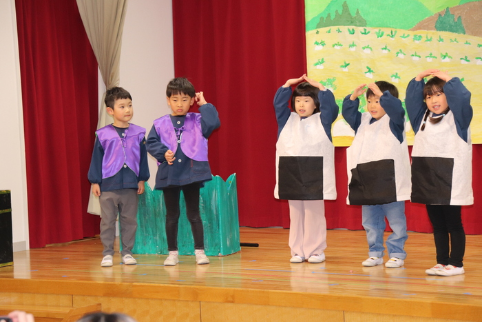 最後を飾るのはすみれ組さん。 (上左)初めの劇は「かっぱわくわく」。 (上右)次の劇は「おむすびころりん」。 やっぱり年長組さんの表現力は豊かです! 合奏は「夢をかなえてドラえもん」。 うたは「キミにはくしゅ!」 歌の合間に手拍子も入ったり・・・やっぱり年長さんは高度ですね。 幼児組みんなががんばった生活発表会でした! | ||
