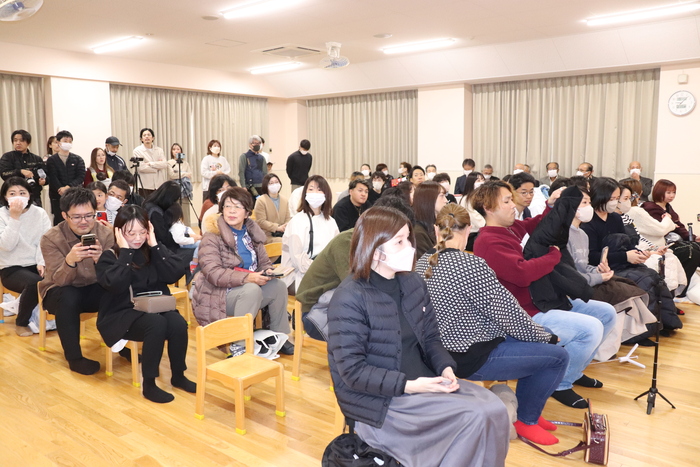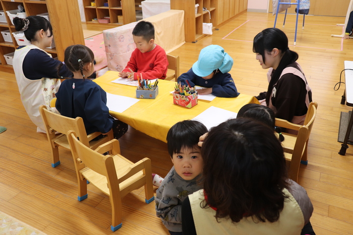前半はお部屋での様子を参観していただきました。 掲示の隙間からコッソリと! お家の人の姿が見えると恋しがってしまいますからね。(笑) | ||