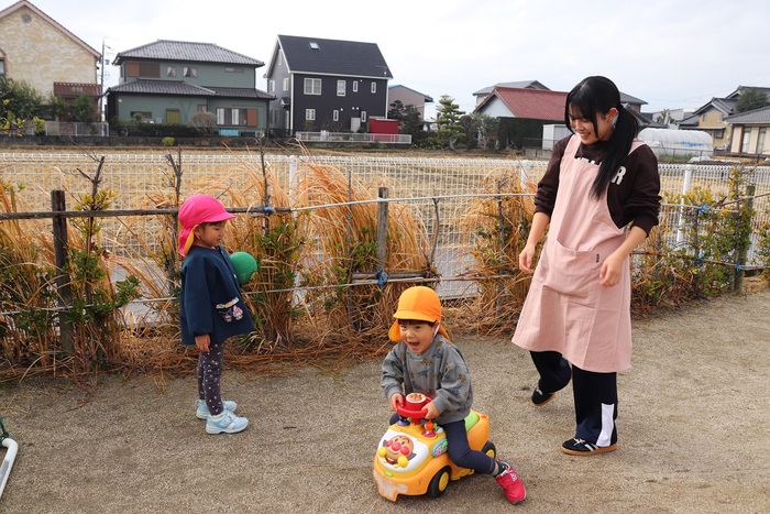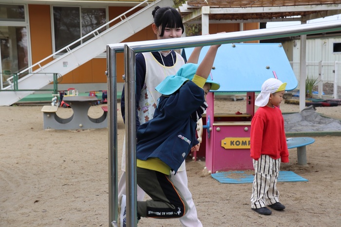 幸い、10時頃から雨も上がったので、外遊びをしていただきました。 お友だちもお姉さんたちと遊ぶのがうれしくて、いつもよりはしゃいでいましたよ。(笑) 将来は、素敵な保育士さんになってくれますね! | ||