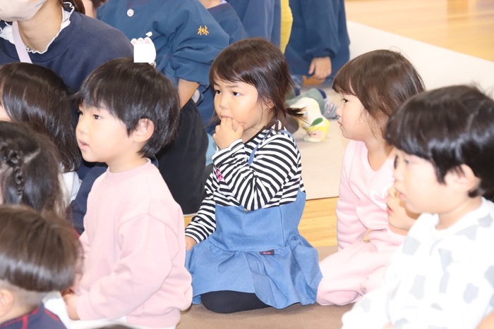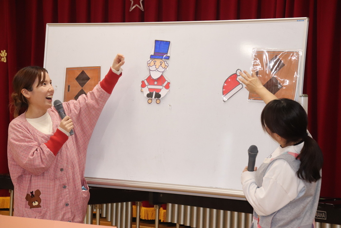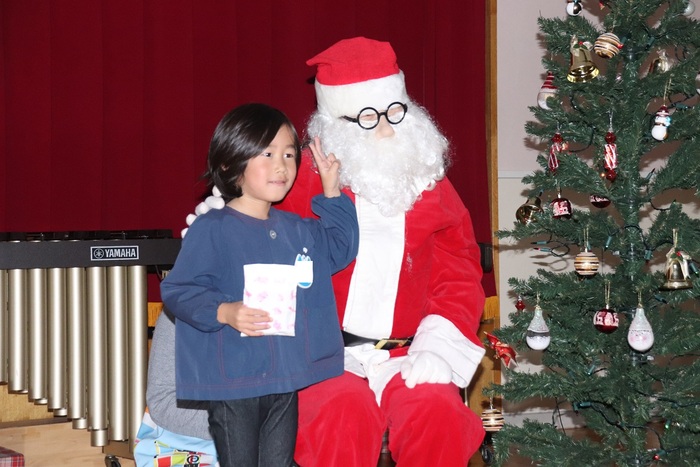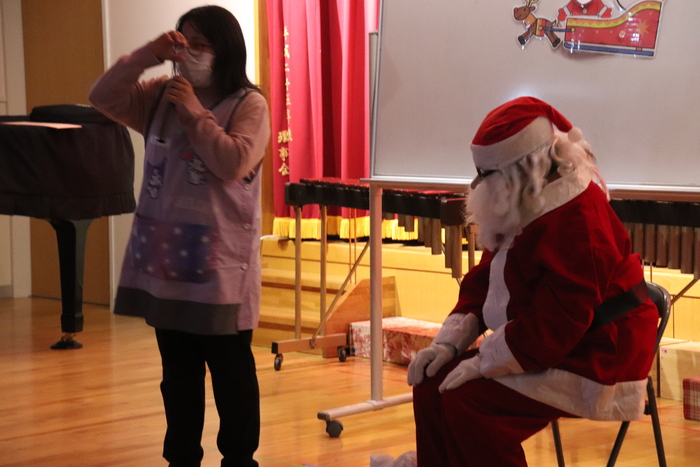 ついに・・・サンタクロースさんが来てくれましたよ!! 先生がサンタさんに質問をすると・・・お友だちの耳は全集中です。(笑) | ||