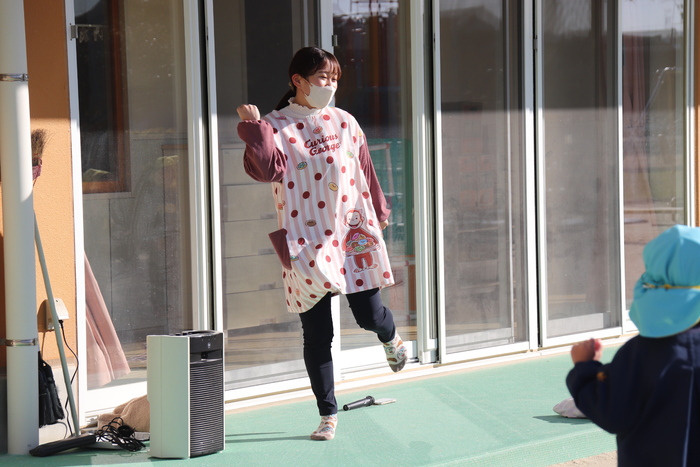 < 1月 6日(火)「スッタカタッタッター♫」> あけましておめでとうございます。 本年もよろしくお願いいたします。 と、厳かな雰囲気で今年の渡保育園が始まるかと思いきや・・・。 今年の初日に園庭から流れてきたのは、「スッタカタッタッター」!!(笑) 「今月の体操」だそうです。 | ||