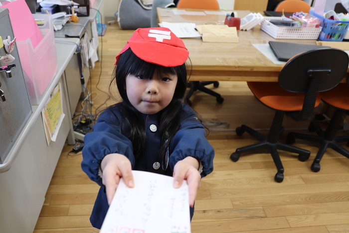 こんなふうに、すみれ組のお友だちが配達をしてくれます。 私にもきました~!!(笑) | ||